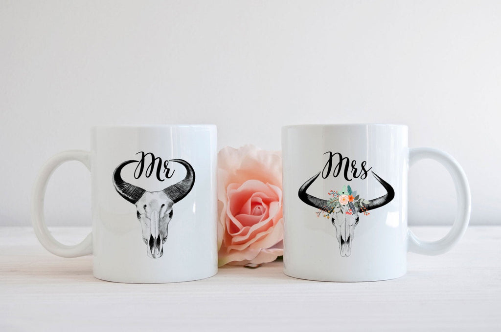 Mr and Mrs Mugs / Western Wedding Gift / Matching Mugs / Cow Skull Mug / Bull Mug /11 or 15 oz.