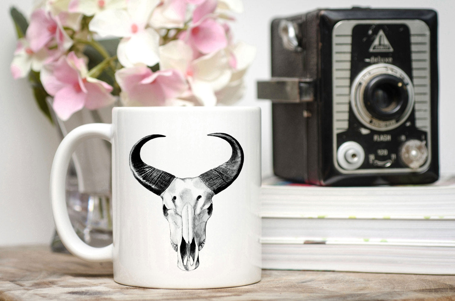 **No Delivery Dates Are Guaranteed. All shipping carriers are currently experiencing delays and transit times can be longer than normal. As a small business, we appreciate your patience and understanding that these circumstances are something that is out of our control. By purchasing this listing you are agreeing that you understand that the shipping date estimation may not be accurate.**Bull Skull Mug / Western Mug / Bull Mug / Cowboy Mug / 11 or 15 oz Mug