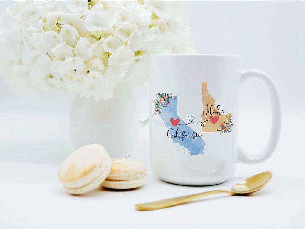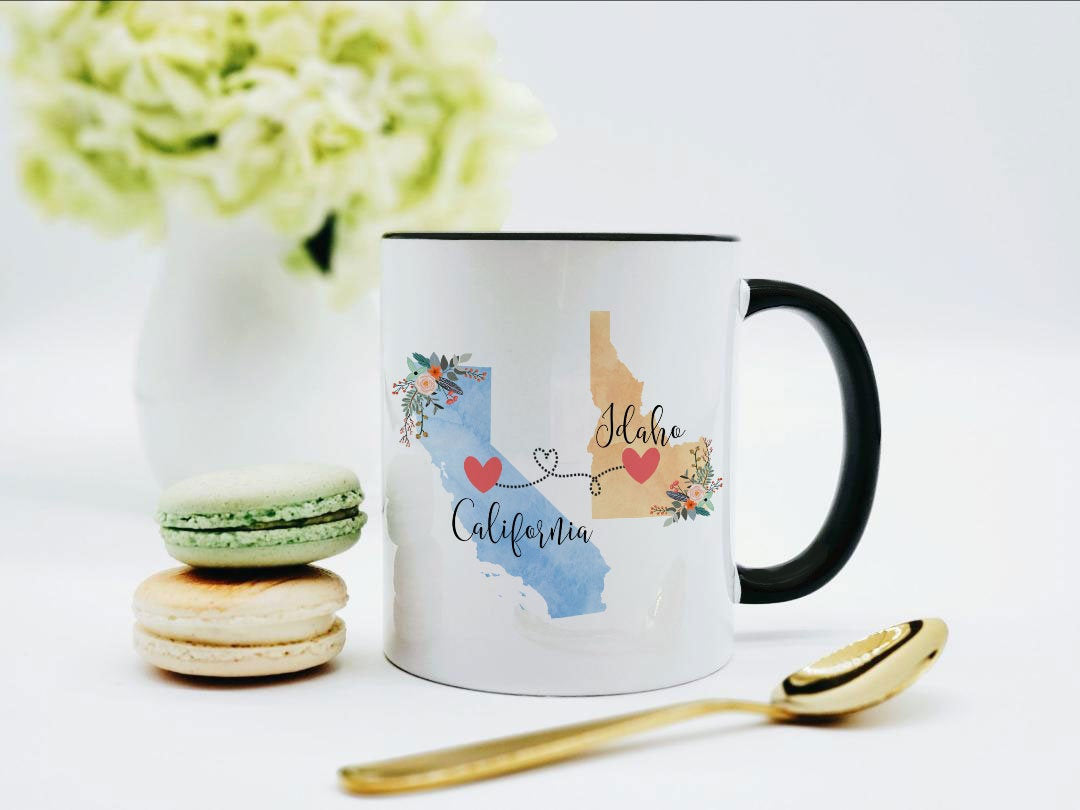 **No Delivery Dates Are Guaranteed. All shipping carriers are currently experiencing delays and transit times can be longer than normal. As a small business, we appreciate your patience and understanding that these circumstances are something that is out of our control. By purchasing this listing you are agreeing that you understand that the shipping date estimation may not be accurate.**California Idaho Mug / Idaho California Mug / California to Idaho Gift / Idaho to California Coffee Cup / 11 or 15 oz This cute mug makes the perfect gift for a long distance friend or family member. Order two and enjoy drinking coffee together even though you're in different states! This mug comes in 11 and 15 oz. Dishwasher and microwave safe. Choose between all white or white with a black handle and rim. Design will be placed on both sides of the mug. Would you like this mug customized with names and the hearts on your cities? If so, purchase this listing: https://www.etsy.com/listing/556829447/two-state-mugs-long-distance-mug **Send me a convo if you are interested in a bulk order so I can save you money on shipping!** Mad Kitty Mugs also has prints. Check out our other shop, Mad Kitty Media, where you'll find custom gold foil prints and other wonderful wall art: https://www.etsy.com/shop/MadKittyMedia ***************************************************************************** We'll quickly ship your mug via Priority mail in a sturdy box with biodegradable peanuts and plenty of protective packaging.