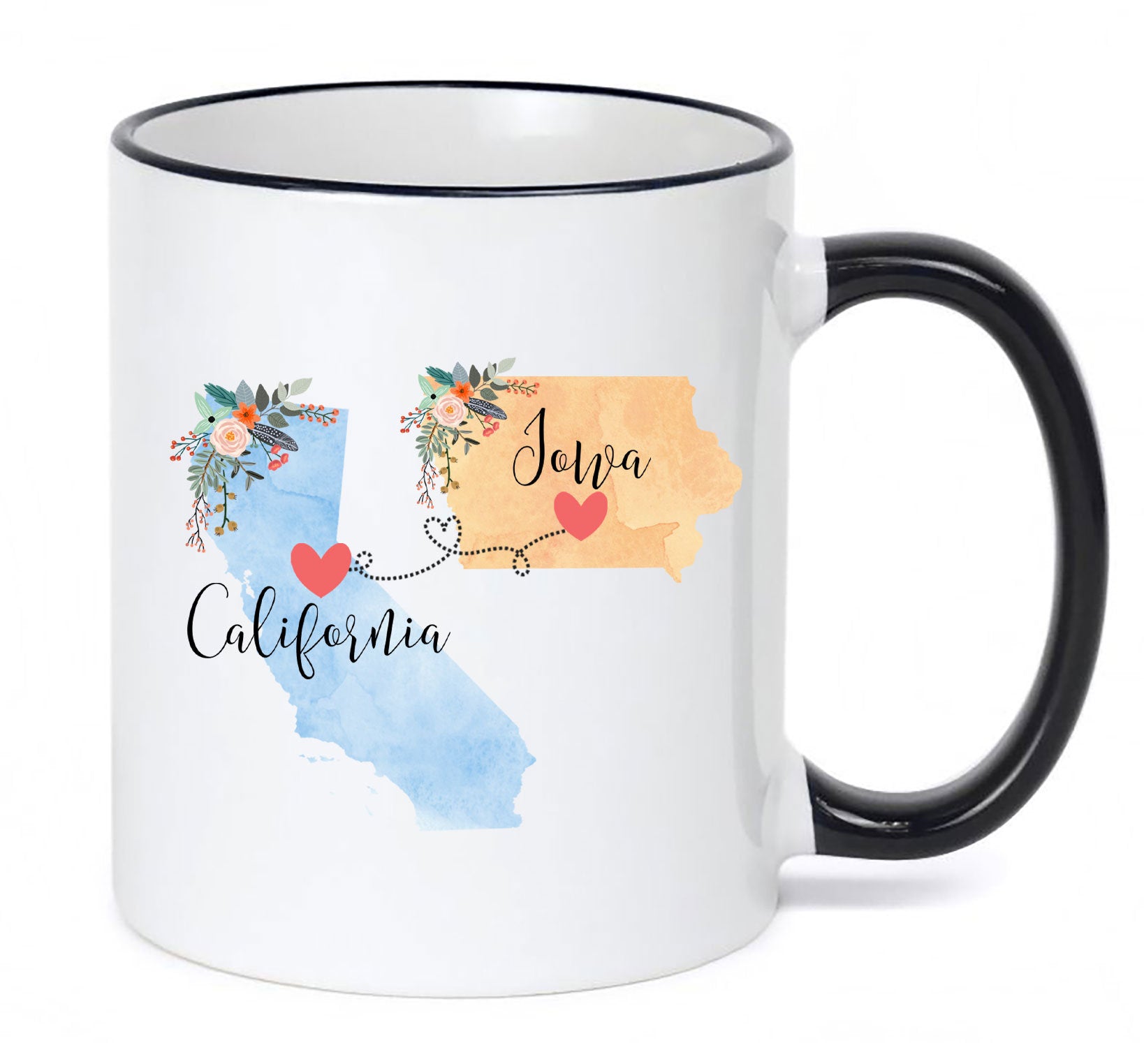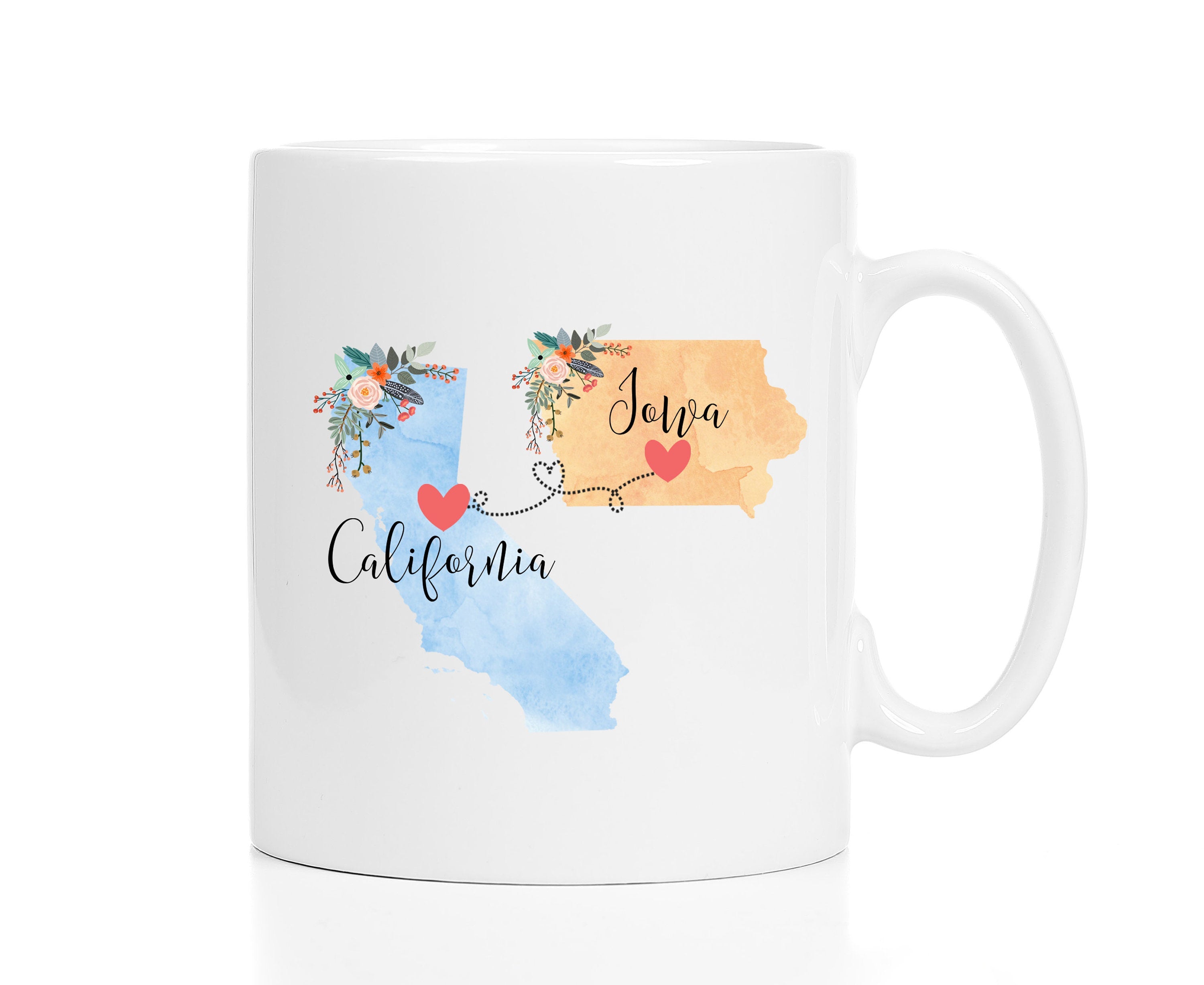 **No Delivery Dates Are Guaranteed. All shipping carriers are currently experiencing delays and transit times can be longer than normal. As a small business, we appreciate your patience and understanding that these circumstances are something that is out of our control. By purchasing this listing you are agreeing that you understand that the shipping date estimation may not be accurate.**California Iowa Mug / Iowa California Mug / California to Iowa Gift / Iowa to California Gift / 11 or 15 oz This cute mug makes the perfect gift for a long distance friend or family member. Order two and enjoy drinking coffee together even though you're in different states! This mug comes in 11 and 15 oz. Dishwasher and microwave safe. Choose between all white or white with a black handle and rim. Design will be placed on both sides of the mug. Would you like this mug customized with names and the hearts on your cities? If so, purchase this listing: https://www.etsy.com/listing/556829447/two-state-mugs-long-distance-mug **Send me a convo if you are interested in a bulk order so I can save you money on shipping!** Mad Kitty Mugs also has prints. Check out our other shop, Mad Kitty Media, where you'll find custom gold foil prints and other wonderful wall art: https://www.etsy.com/shop/MadKittyMedia ***************************************************************************** We'll quickly ship your mug via Priority mail in a sturdy box with biodegradable peanuts and plenty of protective packaging.