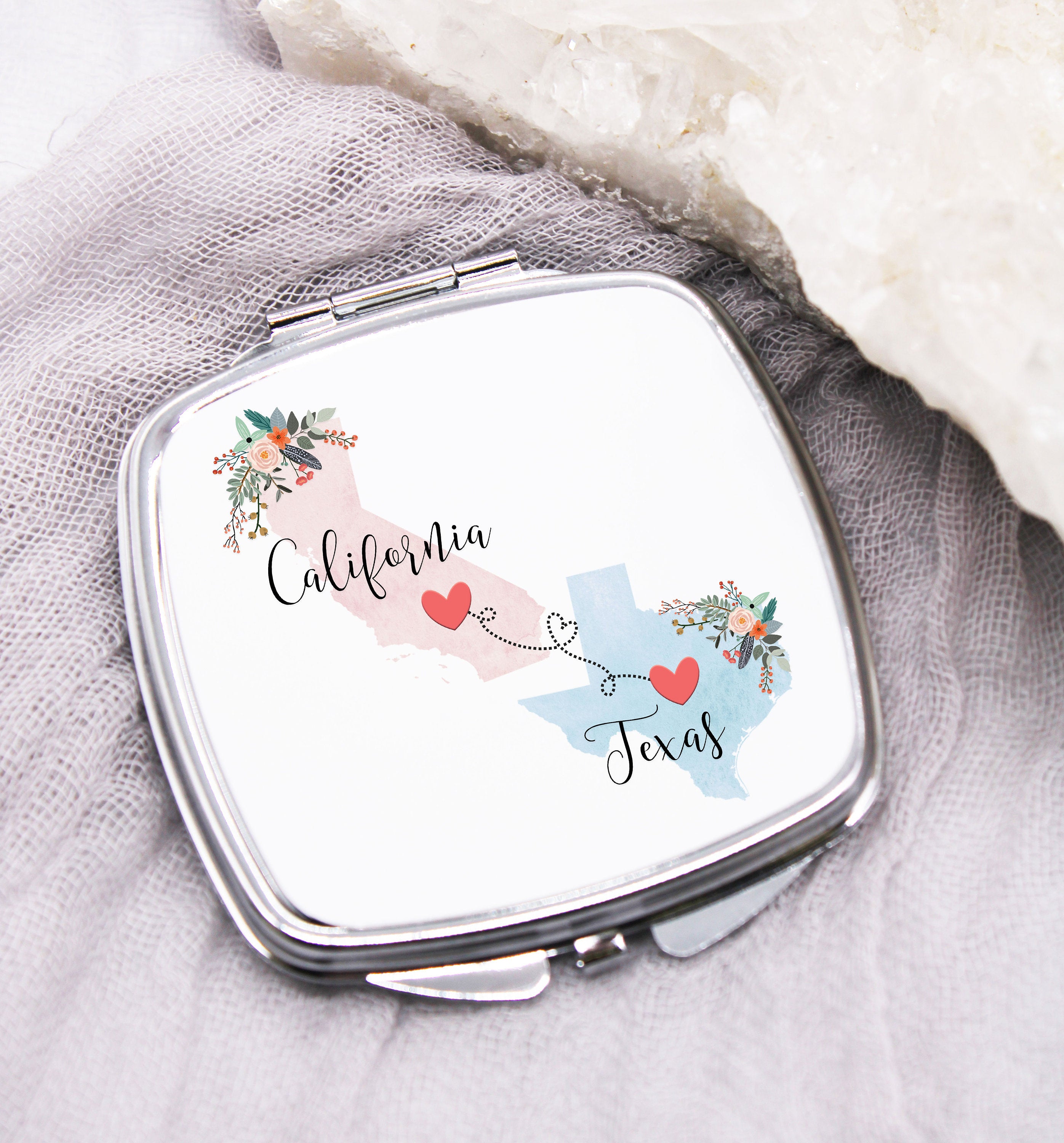 This California and Texas purse mirror is the perfect gift for a long-distance friend or family member, as an adorable reminder of your close relationship!