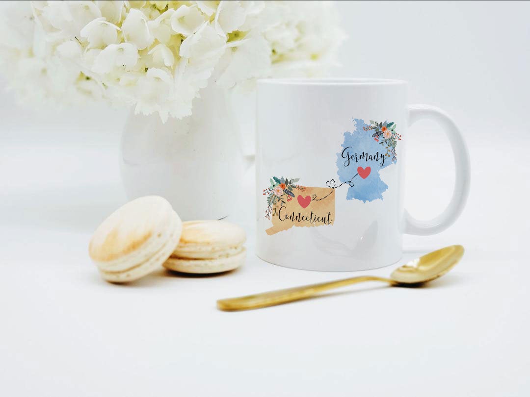 **No Delivery Dates Are Guaranteed. All shipping carriers are currently experiencing delays and transit times can be longer than normal. As a small business, we appreciate your patience and understanding that these circumstances are something that is out of our control. By purchasing this listing you are agreeing that you understand that the shipping date estimation may not be accurate.**Connecticut Germany Mug / Germany Connecticut Mug / Connecticut to Germany Gift / German Exchange Student Gift / Hostess Gift / Germany Cup