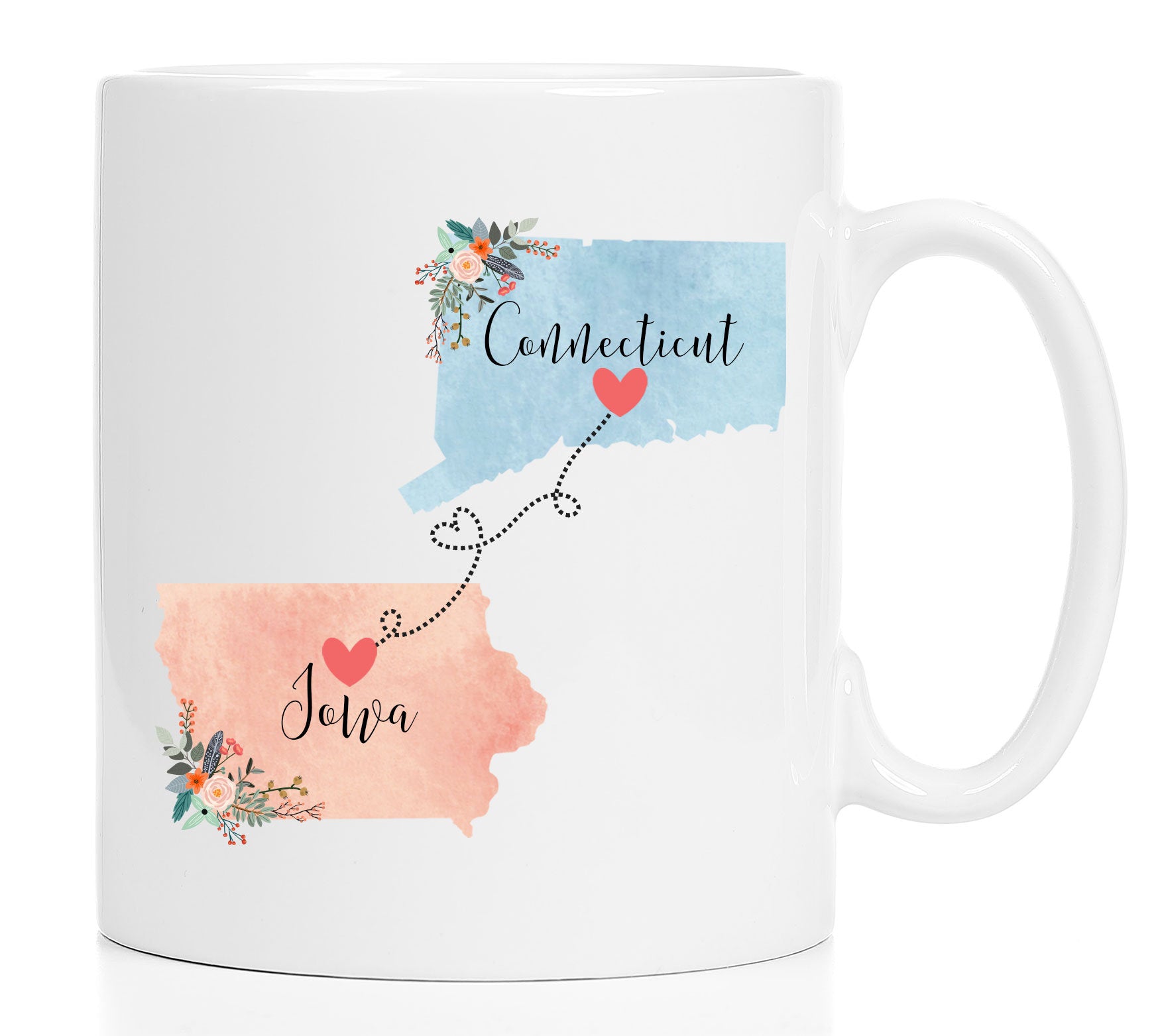 **No Delivery Dates Are Guaranteed. All shipping carriers are currently experiencing delays and transit times can be longer than normal. As a small business, we appreciate your patience and understanding that these circumstances are something that is out of our control. By purchasing this listing you are agreeing that you understand that the shipping date estimation may not be accurate.**Connecticut Iowa Mug / Iowa Connecticut Mug / Connecticut to Iowa Gift / IA to CT Cup / Hostess Gift 11 or 15 oz