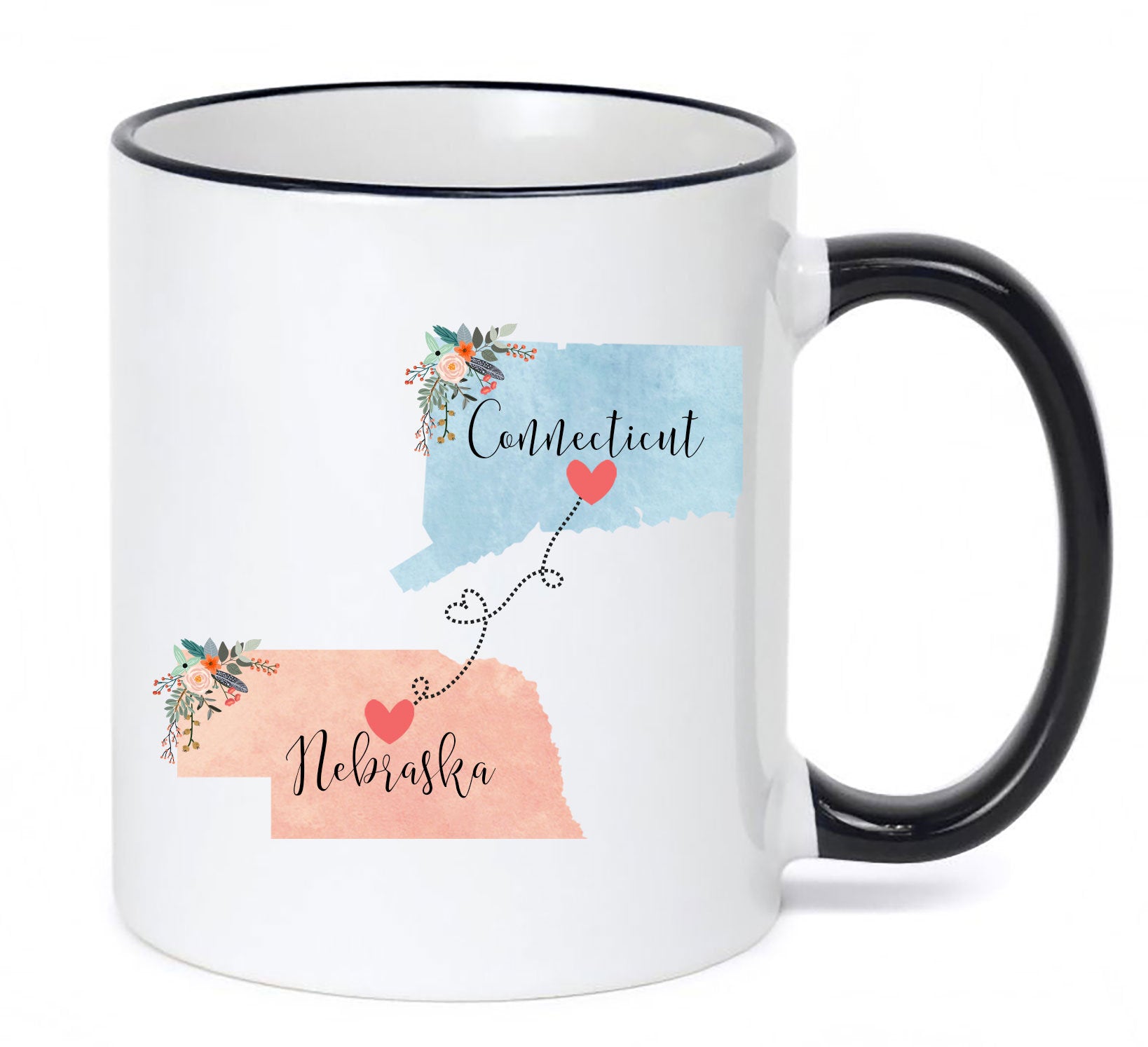 **No Delivery Dates Are Guaranteed. All shipping carriers are currently experiencing delays and transit times can be longer than normal. As a small business, we appreciate your patience and understanding that these circumstances are something that is out of our control. By purchasing this listing you are agreeing that you understand that the shipping date estimation may not be accurate.**Connecticut Nebraska Mug / Nebraska Connecticut Mug / Connecticut to Nebraska Gift / NE to CT Cup / Hostess Gift 11 or 15 oz This cute mug makes the perfect gift for a long distance friend or family member. Order two and enjoy drinking coffee together even though you're in different states! This mug comes in 11 and 15 oz. Dishwasher and microwave safe. Choose between all white or white with a black handle and rim. Design will be placed on both sides of the mug. Would you like this mug customized with names and the hearts on your cities? If so, purchase this listing: https://www.etsy.com/listing/556829447/two-state-mugs-long-distance-mug **Send me a convo if you are interested in a bulk order so I can save you money on shipping!** Mad Kitty Mugs also has prints. Check out our other shop, Mad Kitty Media, where you'll find custom gold foil prints and other wonderful wall art: https://www.etsy.com/shop/MadKittyMedia ***************************************************************************** We'll quickly ship your mug via Priority mail in a sturdy box with biodegradable peanuts and plenty of protective packaging.