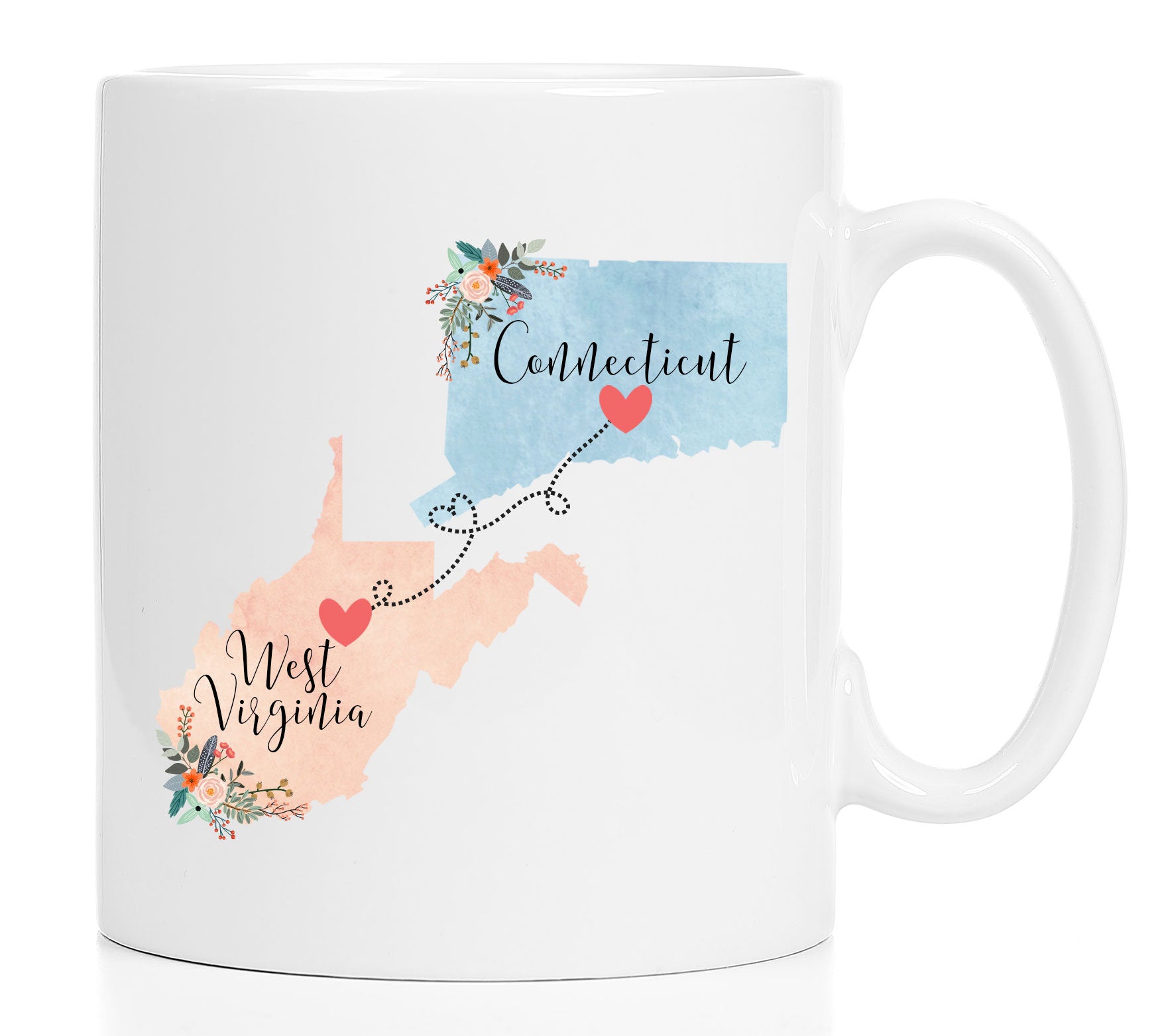 **No Delivery Dates Are Guaranteed. All shipping carriers are currently experiencing delays and transit times can be longer than normal. As a small business, we appreciate your patience and understanding that these circumstances are something that is out of our control. By purchasing this listing you are agreeing that you understand that the shipping date estimation may not be accurate.**Connecticut West Virginia Mug / West Virginia Connecticut Mug / Connecticut to West Virginia Gift / WV to CT Cup / Hostess Gift 11 or 15 oz This cute mug makes the perfect gift for a long distance friend or family member. Order two and enjoy drinking coffee together even though you're in different states! This mug comes in 11 and 15 oz. Dishwasher and microwave safe. Choose between all white or white with a black handle and rim. Design will be placed on both sides of the mug. Would you like this mug customized with names and the hearts on your cities? If so, purchase this listing: https://www.etsy.com/listing/556829447/two-state-mugs-long-distance-mug **Send me a convo if you are interested in a bulk order so I can save you money on shipping!** Mad Kitty Mugs also has prints. Check out our other shop, Mad Kitty Media, where you'll find custom gold foil prints and other wonderful wall art: https://www.etsy.com/shop/MadKittyMedia ***************************************************************************** We'll quickly ship your mug via Priority mail in a sturdy box with biodegradable peanuts and plenty of protective packaging.
