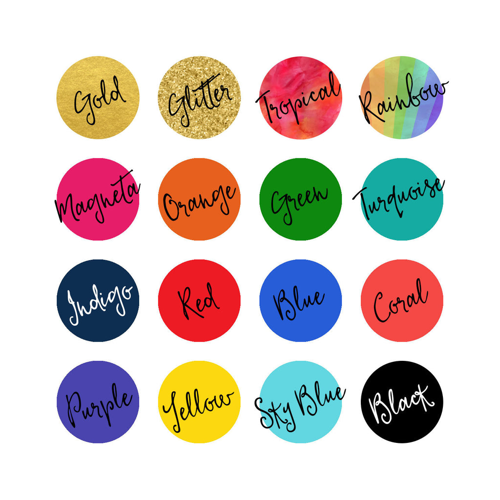 Choose a color, and you're ready to roll. Please note that the gold and glitter colors are done in ink, and are not metallic.