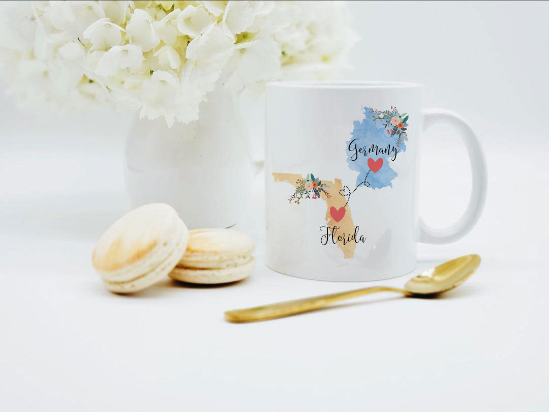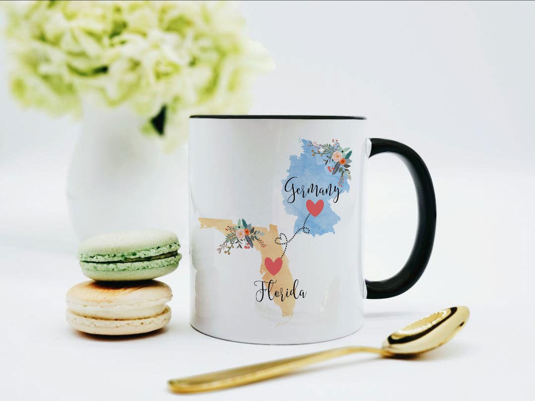 **No Delivery Dates Are Guaranteed. All shipping carriers are currently experiencing delays and transit times can be longer than normal. As a small business, we appreciate your patience and understanding that these circumstances are something that is out of our control. By purchasing this listing you are agreeing that you understand that the shipping date estimation may not be accurate.**Florida Germany Mug / Germany Florida Mug / Florida to Germany Gift / Exchange Student Gift / Germany Hostess Gift / Missing You Gift