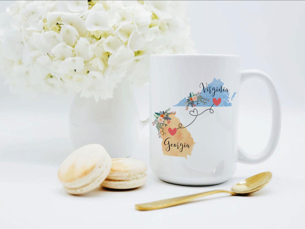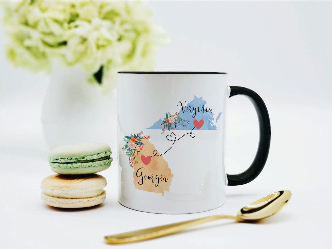 **No Delivery Dates Are Guaranteed. All shipping carriers are currently experiencing delays and transit times can be longer than normal. As a small business, we appreciate your patience and understanding that these circumstances are something that is out of our control. By purchasing this listing you are agreeing that you understand that the shipping date estimation may not be accurate.**Georgia Virginia Mug / Georgia to Virginia Gift / Virginia to Georgia Coffee Mug / Georgia Virginia Cup 11 or 15 oz