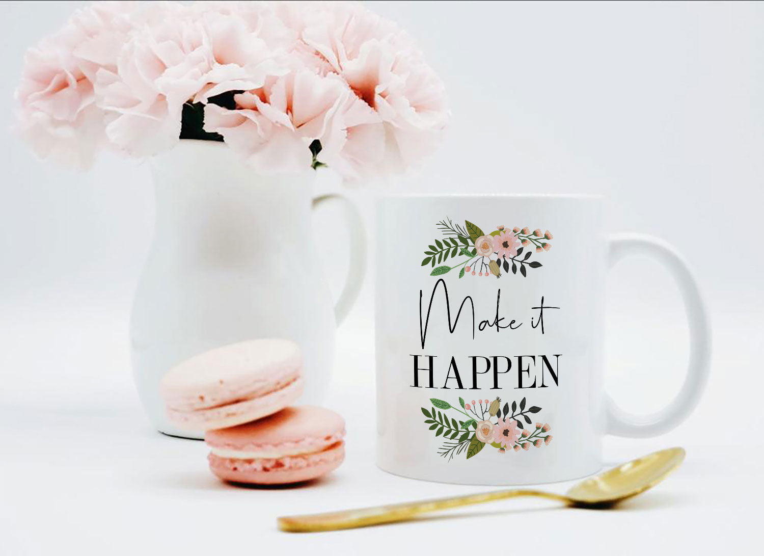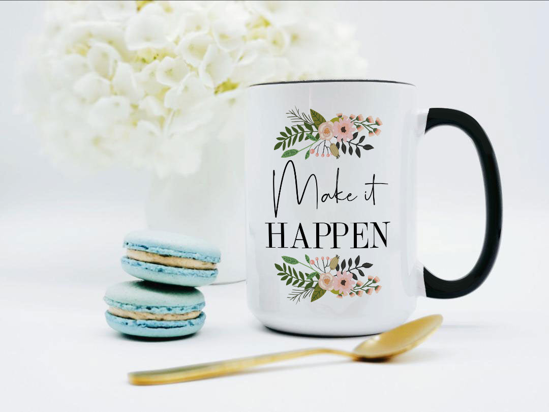 **No Delivery Dates Are Guaranteed. All shipping carriers are currently experiencing delays and transit times can be longer than normal. As a small business, we appreciate your patience and understanding that these circumstances are something that is out of our control. By purchasing this listing you are agreeing that you understand that the shipping date estimation may not be accurate.**Goal Mugs / Make it Happen Mug / Motivational Mug / Entrepreneur Gift / New Business Gift / New Business Owner / Weight Loss Inspiration