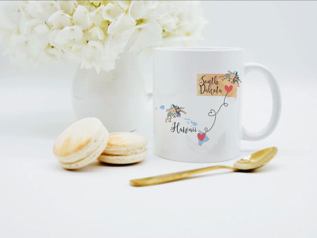 **No Delivery Dates Are Guaranteed. All shipping carriers are currently experiencing delays and transit times can be longer than normal. As a small business, we appreciate your patience and understanding that these circumstances are something that is out of our control. By purchasing this listing you are agreeing that you understand that the shipping date estimation may not be accurate.**Hawaii South Dakota Mug / South Dakota Hawaii Gift / Hawaii to South Dakota Coffee Mug / Hawaii South Dakota Cup / Penpal Gift