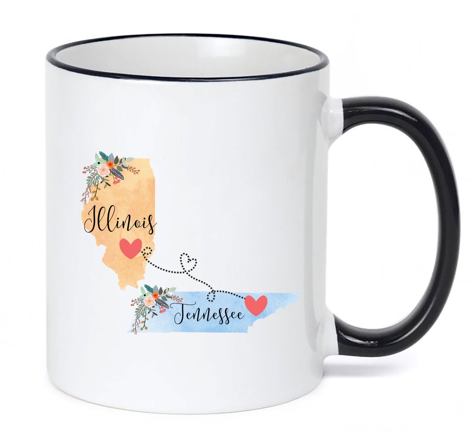 **No Delivery Dates Are Guaranteed. All shipping carriers are currently experiencing delays and transit times can be longer than normal. As a small business, we appreciate your patience and understanding that these circumstances are something that is out of our control. By purchasing this listing you are agreeing that you understand that the shipping date estimation may not be accurate.**Illinois Tennessee Mug / Tennessee Illinois Mug / Illinois to Tennessee Gift / Tennessee to Illinois Gift 11 or 15 oz This cute mug makes the perfect gift for a long distance friend or family member. Order two and enjoy drinking coffee together even though you're in different states! This mug comes in 11 and 15 oz. Dishwasher and microwave safe. Choose between all white or white with a black handle and rim. Design will be placed on both sides of the mug. Would you like this mug customized with names and the hearts on your cities? If so, purchase this listing: https://www.etsy.com/listing/556829447/two-state-mugs-long-distance-mug **Send me a convo if you are interested in a bulk order so I can save you money on shipping!** Mad Kitty Mugs also has prints. Check out our other shop, Mad Kitty Media, where you'll find custom gold foil prints and other wonderful wall art: https://www.etsy.com/shop/MadKittyMedia ***************************************************************************** We'll quickly ship your mug via Priority mail in a sturdy box with biodegradable peanuts and plenty of protective packaging.