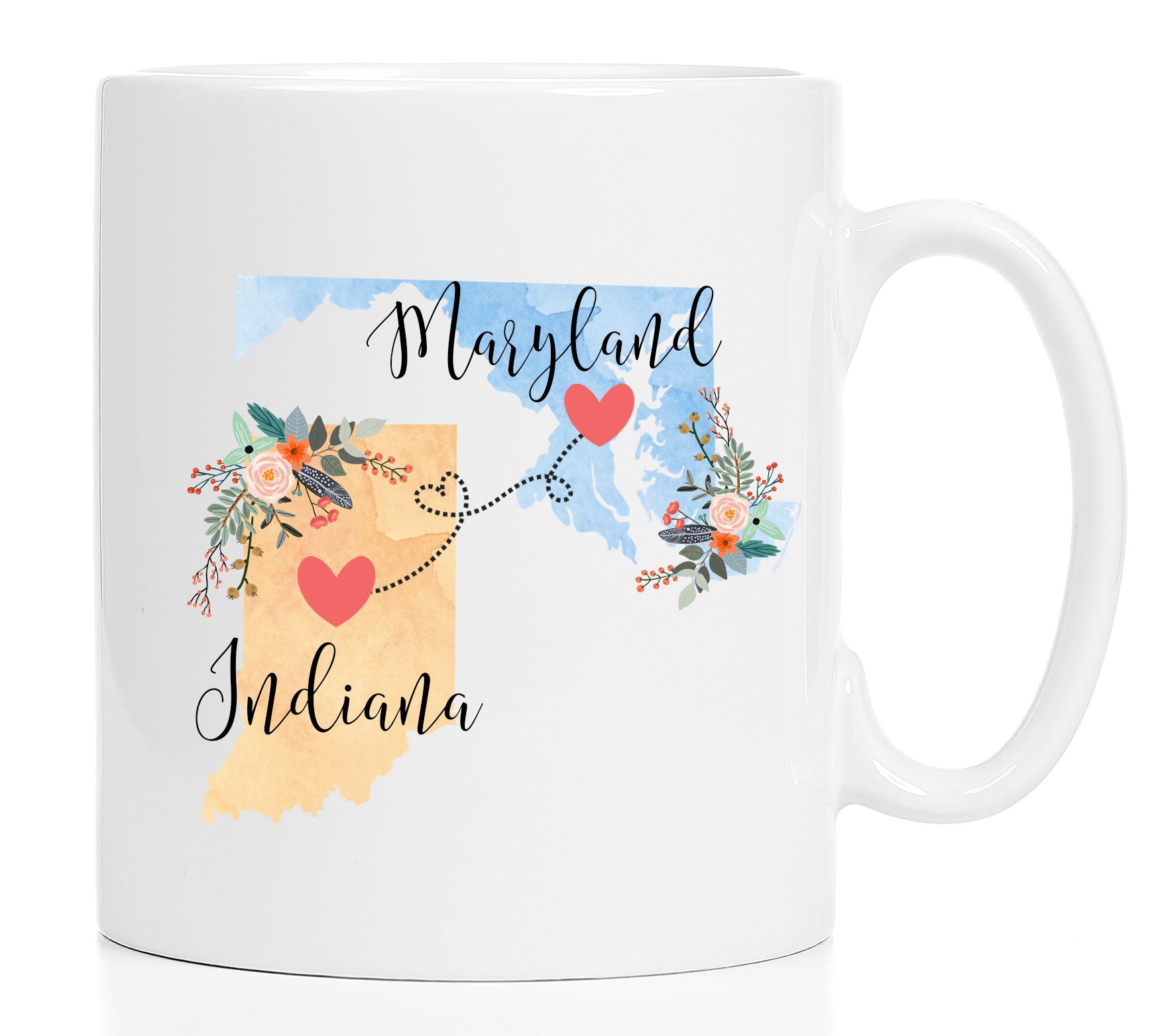 **No Delivery Dates Are Guaranteed. All shipping carriers are currently experiencing delays and transit times can be longer than normal. As a small business, we appreciate your patience and understanding that these circumstances are something that is out of our control. By purchasing this listing you are agreeing that you understand that the shipping date estimation may not be accurate.**Indiana Maryland Mug / Maryland Indiana Mug / Indiana to Maryland Gift / Maryland to Indiana Coffee Mug Cup / 11 or 15 oz This cute mug makes the perfect gift for a long distance friend or family member. Order two and enjoy drinking coffee together even though you're in different states! This mug comes in 11 and 15 oz. Dishwasher and microwave safe. Choose between all white or white with a black handle and rim. Design will be placed on both sides of the mug. Would you like this mug customized with names and the hearts on your cities? If so, purchase this listing: https://www.etsy.com/listing/556829447/two-state-mugs-long-distance-mug **Send me a convo if you are interested in a bulk order so I can save you money on shipping!** Mad Kitty Mugs also has prints. Check out our other shop, Mad Kitty Media, where you'll find custom gold foil prints and other wonderful wall art: https://www.etsy.com/shop/MadKittyMedia ***************************************************************************** We'll quickly ship your mug via Priority mail in a sturdy box with biodegradable peanuts and plenty of protective packaging.