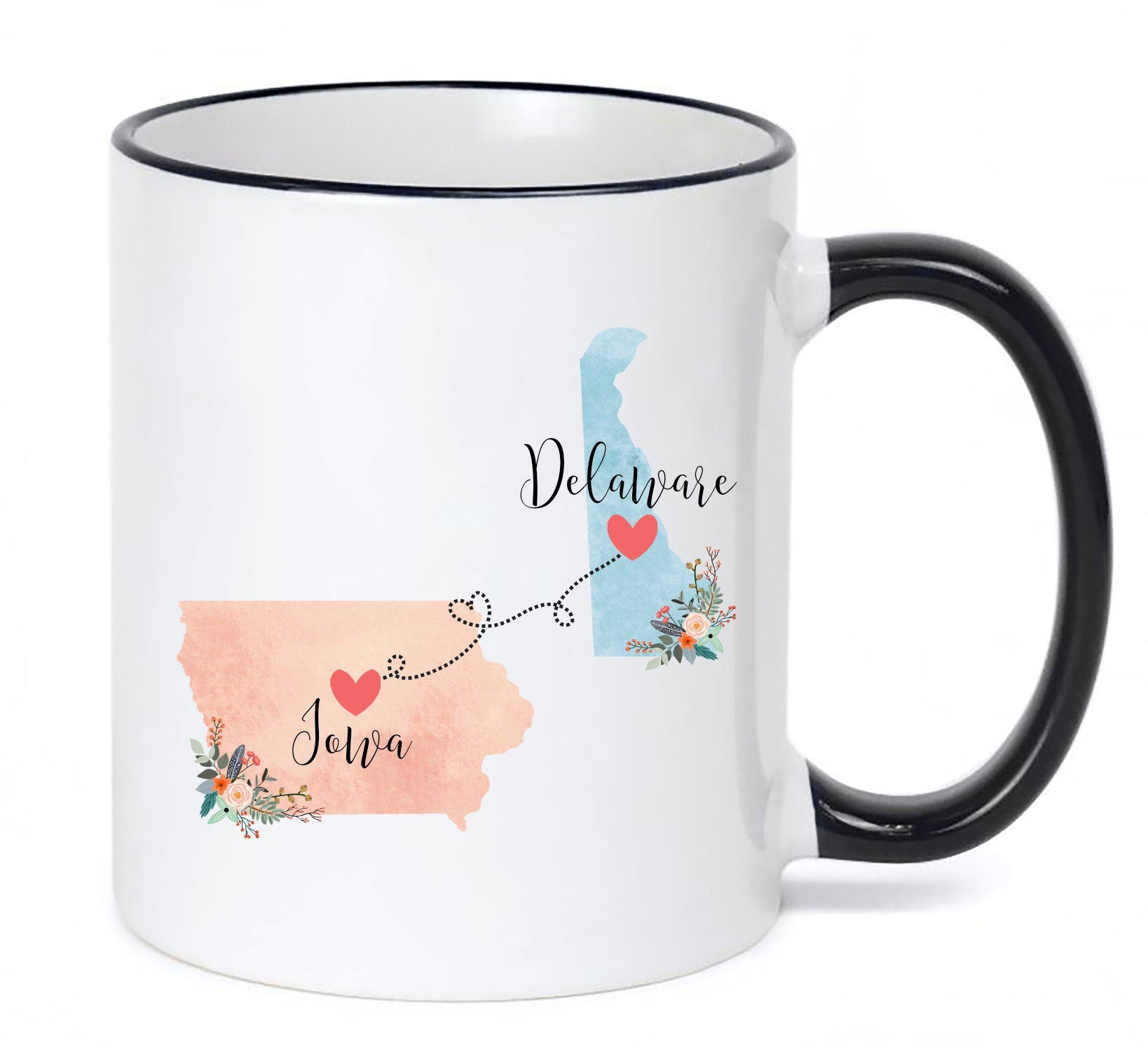 **No Delivery Dates Are Guaranteed. All shipping carriers are currently experiencing delays and transit times can be longer than normal. As a small business, we appreciate your patience and understanding that these circumstances are something that is out of our control. By purchasing this listing you are agreeing that you understand that the shipping date estimation may not be accurate.**Iowa Delaware Mug / Delaware Iowa Mug / Iowa to Delaware Gift / Delaware to Iowa Cup / Hostess Gift 11 or 15 oz This cute mug makes the perfect gift for a long distance friend or family member. Order two and enjoy drinking coffee together even though you're in different states! This mug comes in 11 and 15 oz. Dishwasher and microwave safe. Choose between all white or white with a black handle and rim. Design will be placed on both sides of the mug. Would you like this mug customized with names and the hearts on your cities? If so, purchase this listing: https://www.etsy.com/listing/556829447/two-state-mugs-long-distance-mug **Send me a convo if you are interested in a bulk order so I can save you money on shipping!** Mad Kitty Mugs also has prints. Check out our other shop, Mad Kitty Media, where you'll find custom gold foil prints and other wonderful wall art: https://www.etsy.com/shop/MadKittyMedia ***************************************************************************** We'll quickly ship your mug via Priority mail in a sturdy box with biodegradable peanuts and plenty of protective packaging.