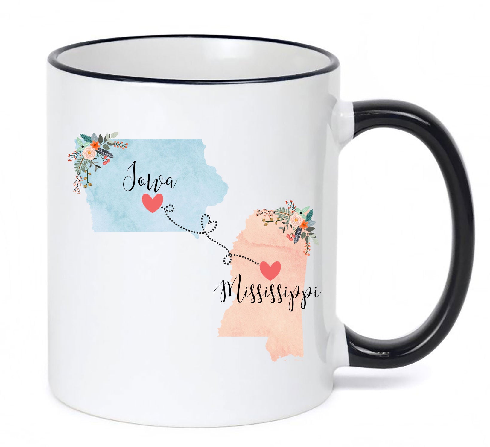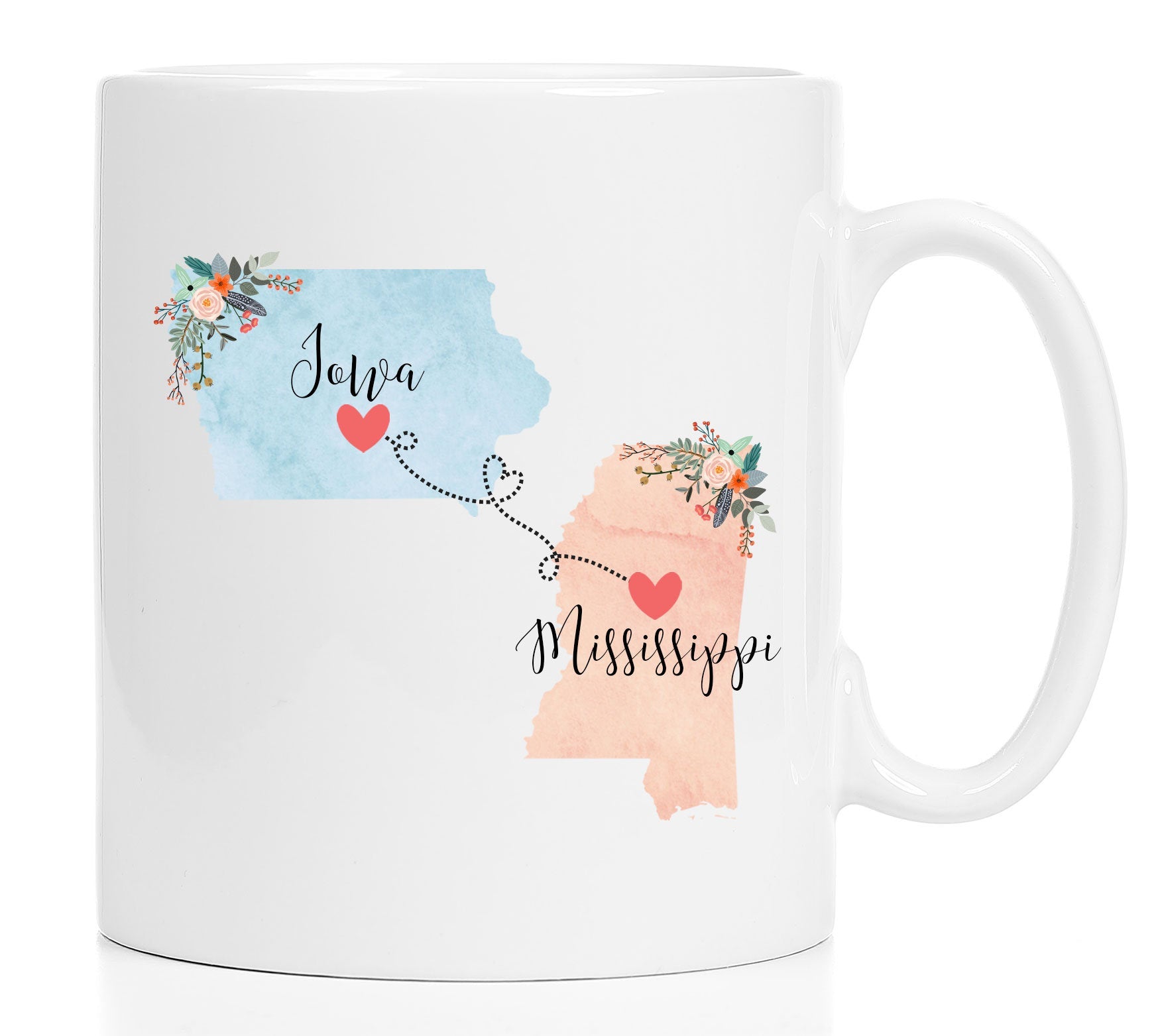 **No Delivery Dates Are Guaranteed. All shipping carriers are currently experiencing delays and transit times can be longer than normal. As a small business, we appreciate your patience and understanding that these circumstances are something that is out of our control. By purchasing this listing you are agreeing that you understand that the shipping date estimation may not be accurate.**Iowa Mississippi Mug / Mississippi Iowa Mug / Arkansas to Mississippi Gift / MI to IA Cup / Hostess Gift 11 or 15 oz