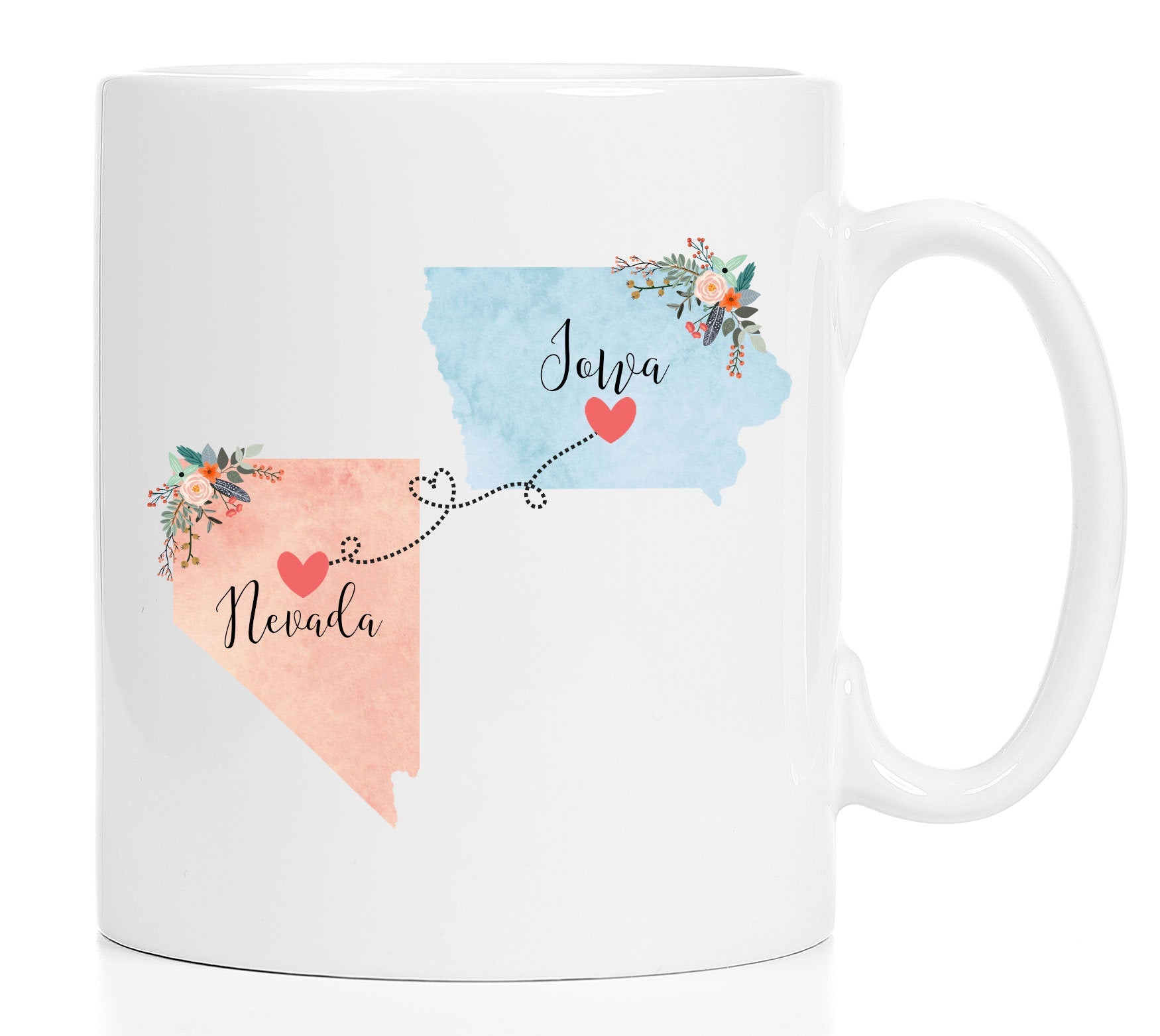 **No Delivery Dates Are Guaranteed. All shipping carriers are currently experiencing delays and transit times can be longer than normal. As a small business, we appreciate your patience and understanding that these circumstances are something that is out of our control. By purchasing this listing you are agreeing that you understand that the shipping date estimation may not be accurate.**Iowa Nevada Mug / Nevada Iowa Mug / Iowa to Nevada Gift / NV to IA Cup / Hostess Gift 11 or 15 oz
