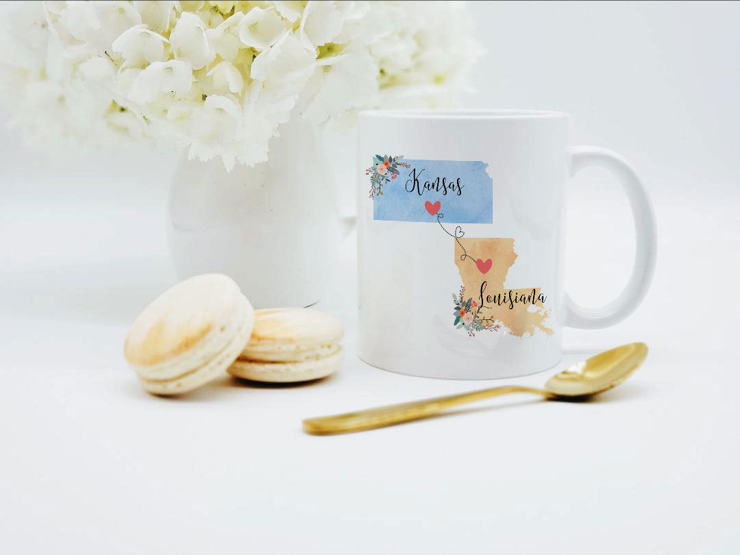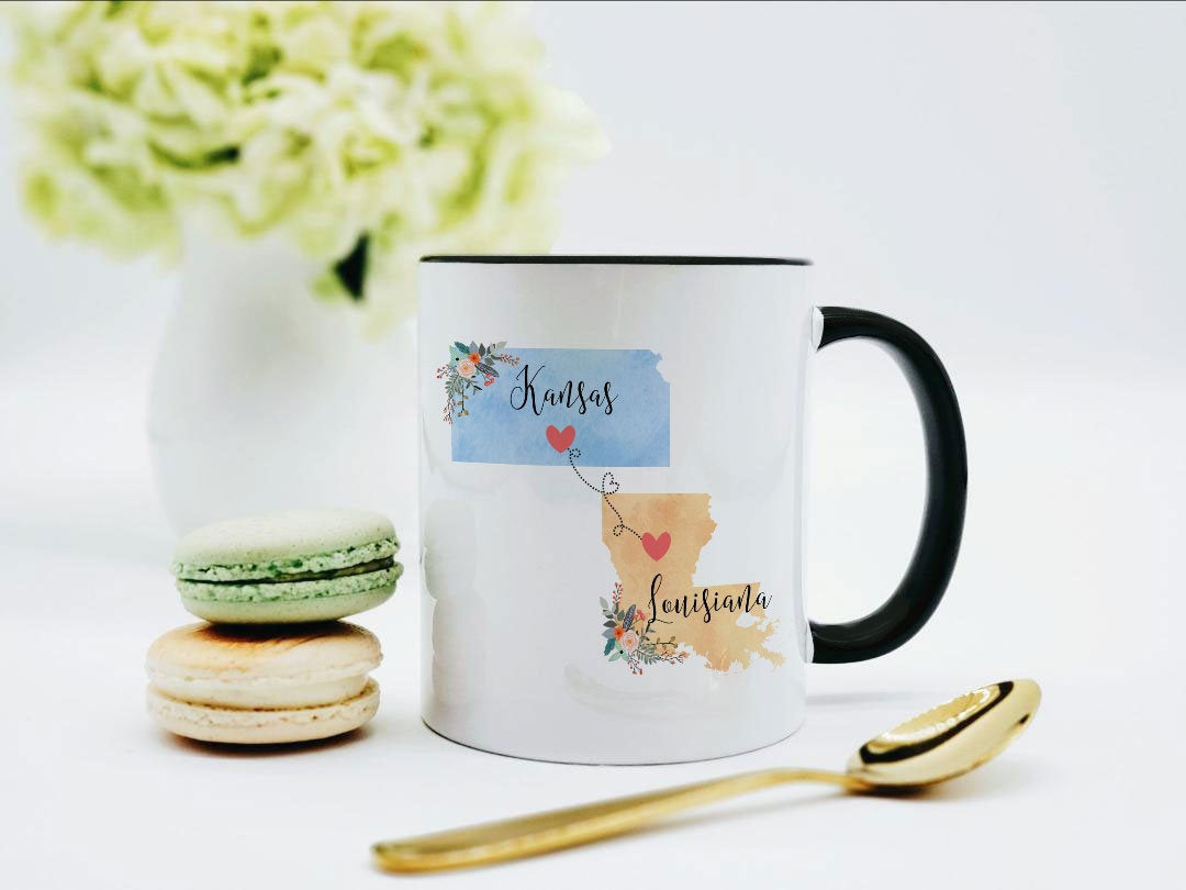 **No Delivery Dates Are Guaranteed. All shipping carriers are currently experiencing delays and transit times can be longer than normal. As a small business, we appreciate your patience and understanding that these circumstances are something that is out of our control. By purchasing this listing you are agreeing that you understand that the shipping date estimation may not be accurate.**Kansas Louisiana Mug / Louisiana Kansas Mug / Kansas to Louisiana Gift / Louisiana Hostess Gift / Louisiana Best Friend Gift / 11 or 15 oz