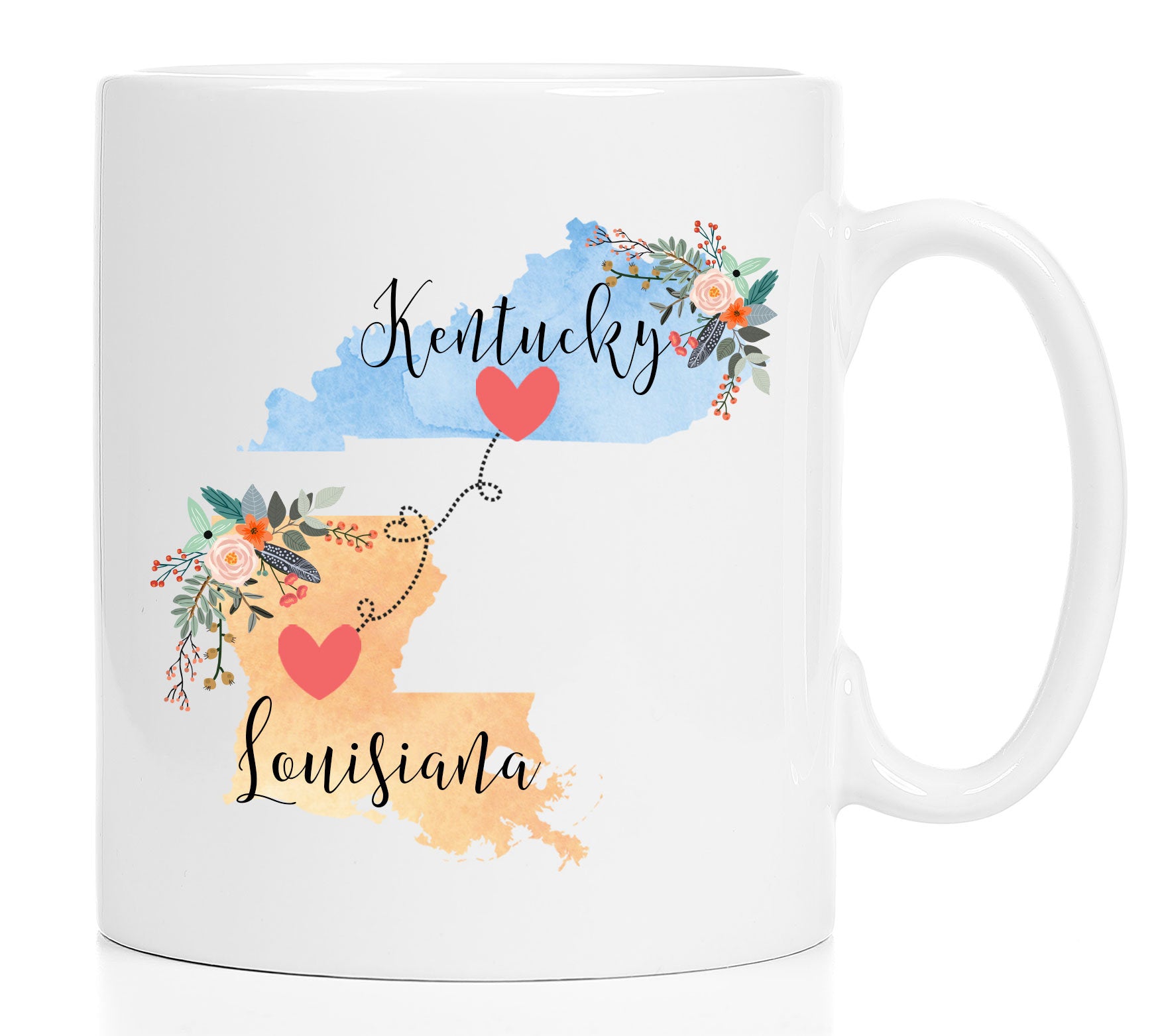 **No Delivery Dates Are Guaranteed. All shipping carriers are currently experiencing delays and transit times can be longer than normal. As a small business, we appreciate your patience and understanding that these circumstances are something that is out of our control. By purchasing this listing you are agreeing that you understand that the shipping date estimation may not be accurate.**Louisiana Kentucky Mug / Kentucky Louisiana Mug / Louisiana to Kentucky Gift / Kentucky to Louisiana Gift / Cup / 11 or 15 oz This cute mug makes the perfect gift for a long distance friend or family member. Order two and enjoy drinking coffee together even though you're in different states! This mug comes in 11 and 15 oz. Dishwasher and microwave safe. Choose between all white or white with a black handle and rim. Design will be placed on both sides of the mug. Would you like this mug customized with names and the hearts on your cities? If so, purchase this listing: https://www.etsy.com/listing/556829447/two-state-mugs-long-distance-mug **Send me a convo if you are interested in a bulk order so I can save you money on shipping!** Mad Kitty Mugs also has prints. Check out our other shop, Mad Kitty Media, where you'll find custom gold foil prints and other wonderful wall art: https://www.etsy.com/shop/MadKittyMedia ***************************************************************************** We'll quickly ship your mug via Priority mail in a sturdy box with biodegradable peanuts and plenty of protective packaging.