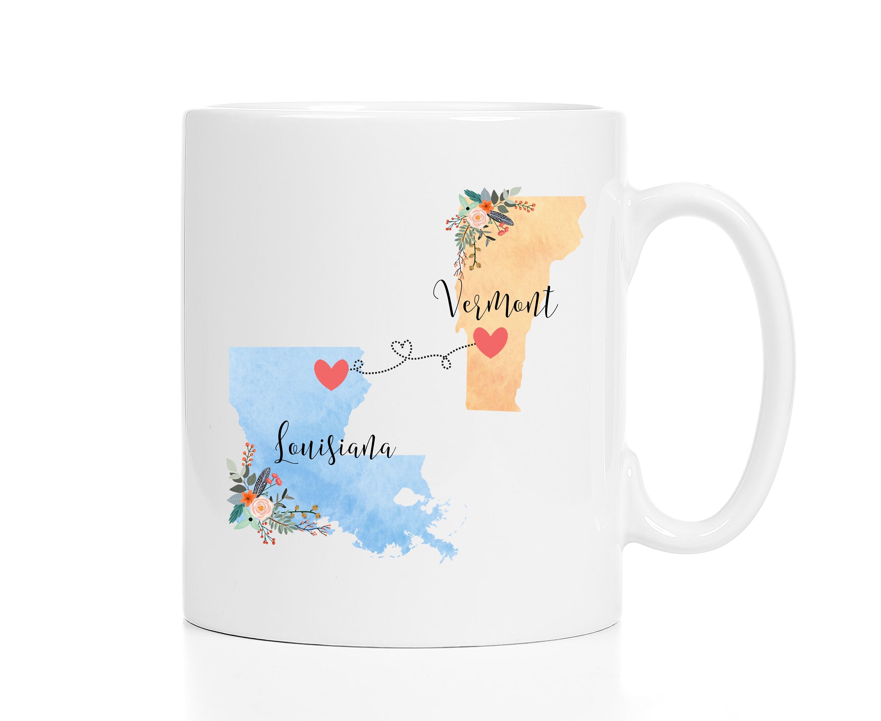 **No Delivery Dates Are Guaranteed. All shipping carriers are currently experiencing delays and transit times can be longer than normal. As a small business, we appreciate your patience and understanding that these circumstances are something that is out of our control. By purchasing this listing you are agreeing that you understand that the shipping date estimation may not be accurate.**Louisiana Vermont Mug /Vermont Louisiana Mug / College Student Gift/Going Away Gift/College Student Going Away/ 11 or 15 oz This cute mug makes the perfect gift for a long distance friend or family member. Order two and enjoy drinking coffee together even though you're in different states! This mug comes in 11 and 15 oz. Dishwasher and microwave safe. Choose between all white or white with a black handle and rim. Design will be placed on both sides of the mug. Would you like this mug customized with names and the hearts on your cities? If so, purchase this listing: https://www.etsy.com/listing/556829447/two-state-mugs-long-distance-mug **Send me a convo if you are interested in a bulk order so I can save you money on shipping!** Mad Kitty Mugs also has prints. Check out our other shop, Mad Kitty Media, where you'll find custom gold foil prints and other wonderful wall art: https://www.etsy.com/shop/MadKittyMedia ***************************************************************************** We'll quickly ship your mug via Priority mail in a sturdy box with biodegradable peanuts and plenty of protective packaging.
