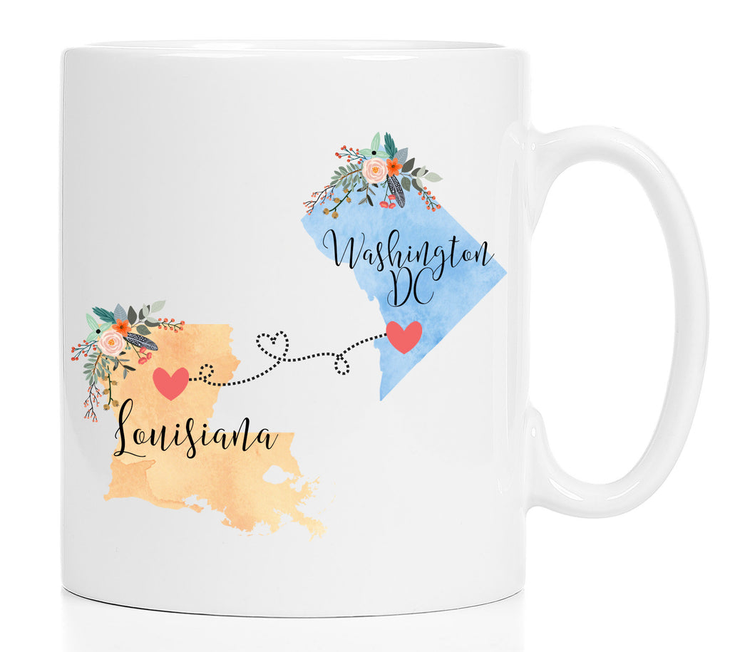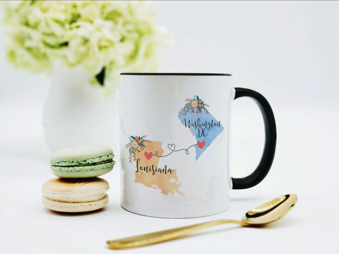 **No Delivery Dates Are Guaranteed. All shipping carriers are currently experiencing delays and transit times can be longer than normal. As a small business, we appreciate your patience and understanding that these circumstances are something that is out of our control. By purchasing this listing you are agreeing that you understand that the shipping date estimation may not be accurate.**Louisiana Washington DC Mug / Washington DC Louisiana Mug / State Heart Mug / State Heart Love Mug / Missing You Mug / State Gifts