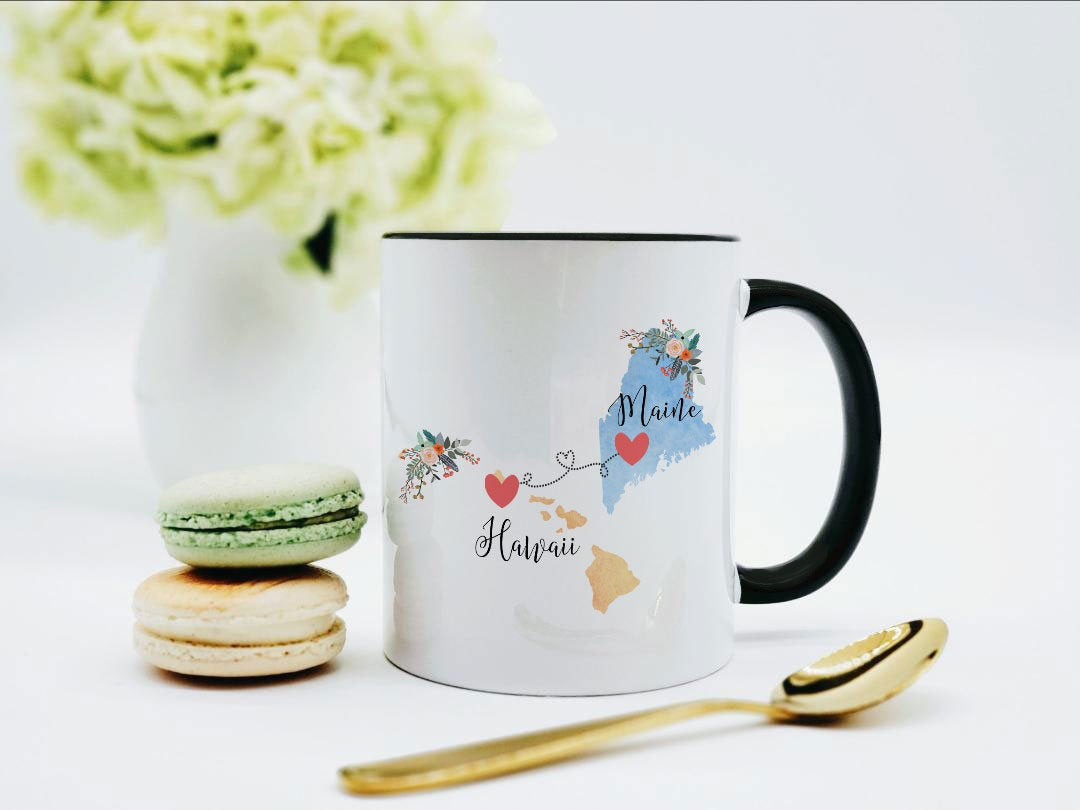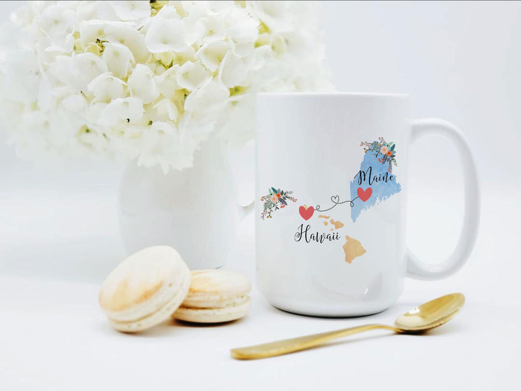 **No Delivery Dates Are Guaranteed. All shipping carriers are currently experiencing delays and transit times can be longer than normal. As a small business, we appreciate your patience and understanding that these circumstances are something that is out of our control. By purchasing this listing you are agreeing that you understand that the shipping date estimation may not be accurate.**Maine Hawaii Mug / Hawaii Maine Gift / NMaine to Hawaii Coffee Mug / Hawaii to Maine Cup / Hostess Gift / 11 or 15 oz