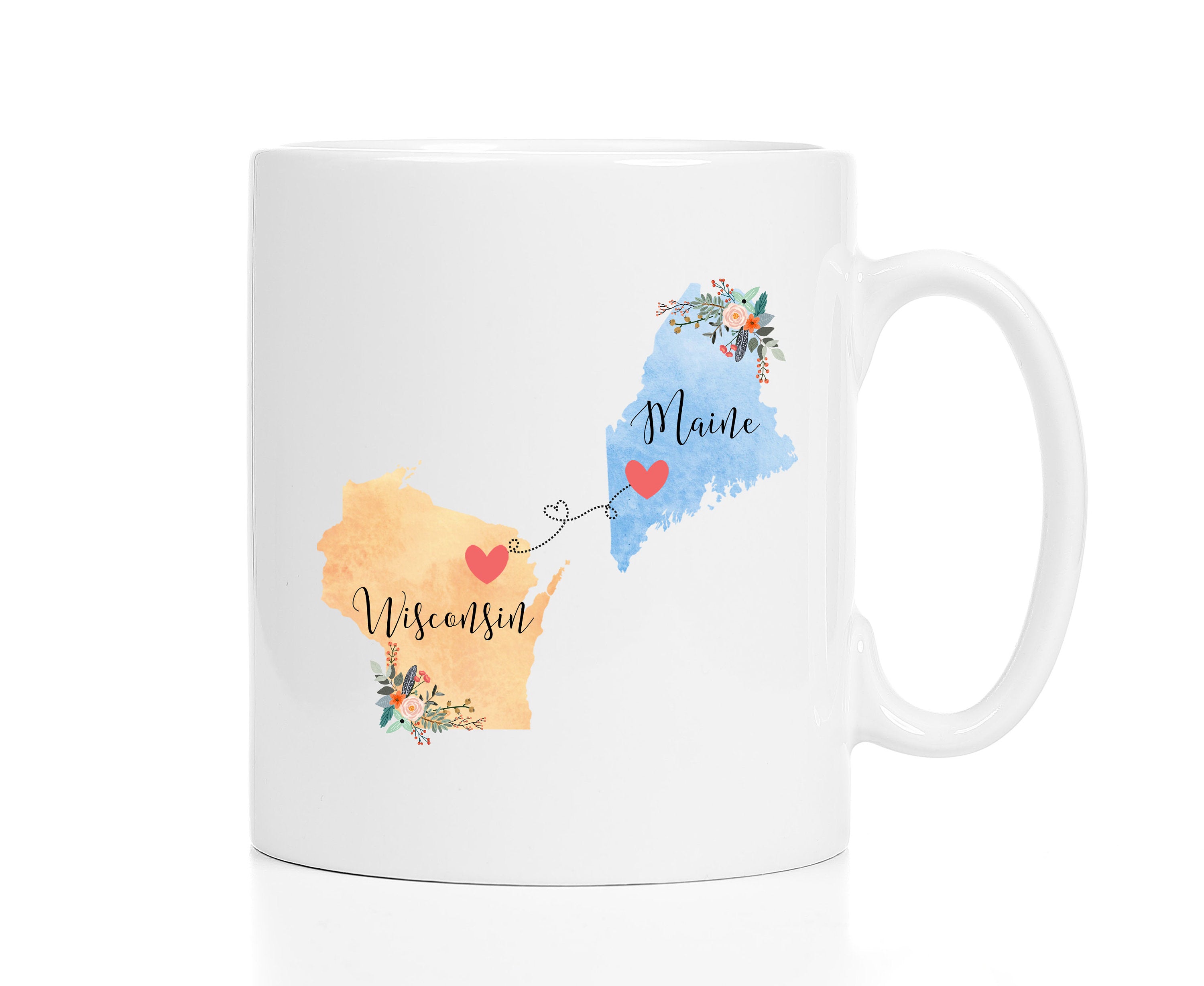 **No Delivery Dates Are Guaranteed. All shipping carriers are currently experiencing delays and transit times can be longer than normal. As a small business, we appreciate your patience and understanding that these circumstances are something that is out of our control. By purchasing this listing you are agreeing that you understand that the shipping date estimation may not be accurate.**Maine Wisconsin Mug / Maine to Wisconsin Coffee Mug / Wisconsin Maine Gift / Missing You Gifts / State Love Mug / State to State Mug