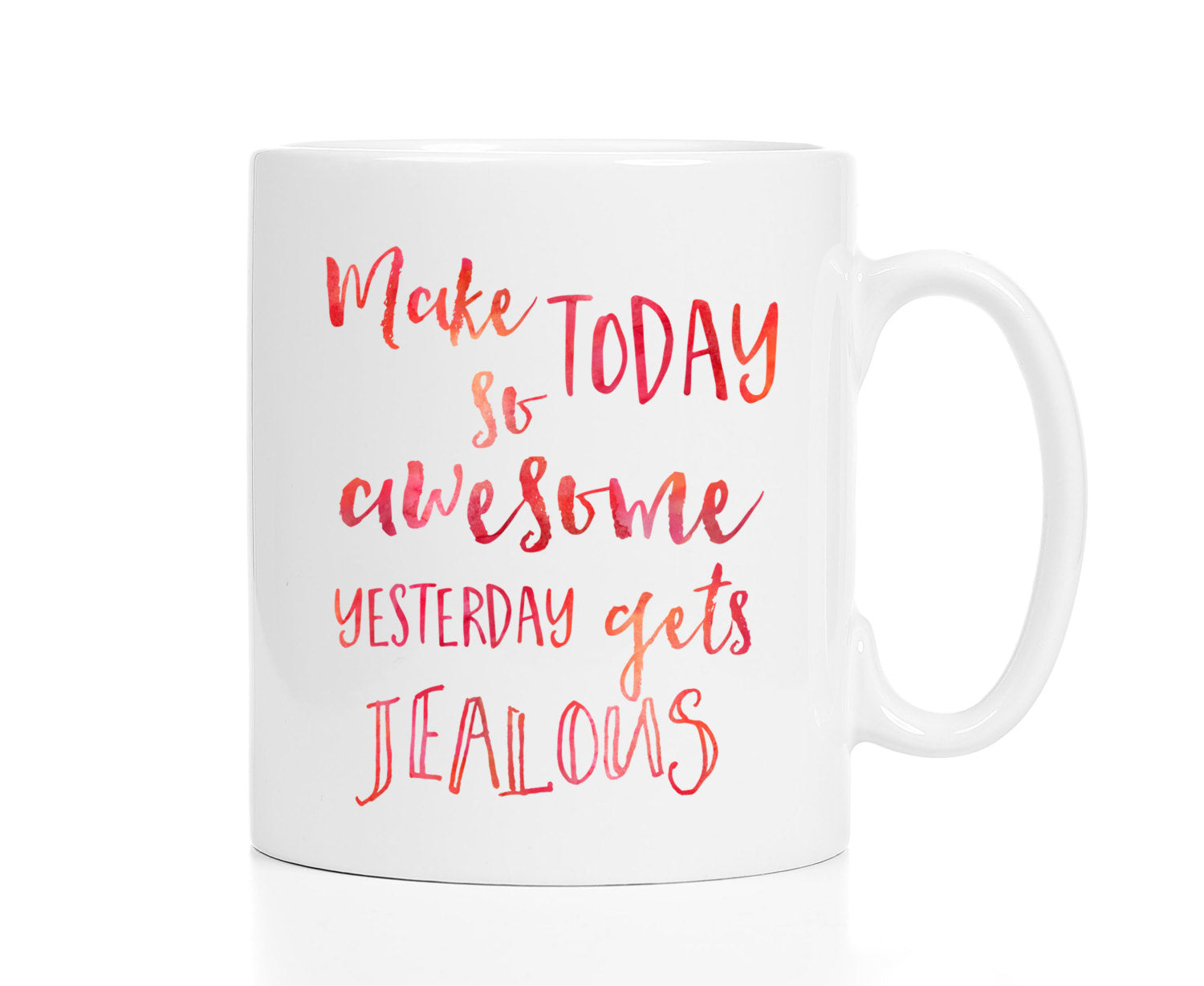 **No Delivery Dates Are Guaranteed. All shipping carriers are currently experiencing delays and transit times can be longer than normal. As a small business, we appreciate your patience and understanding that these circumstances are something that is out of our control. By purchasing this listing you are agreeing that you understand that the shipping date estimation may not be accurate.**Make Today So Awesome Yesterday Gets Jealous Mug / Rainbow Mug / Positive Mug / Happy Mug / Encouraging Mug / Happy Coffee Cup Make today so awesome yesterday gets jealous. :) This mug comes in both the standard 11 oz. size and a large 15 oz. Dishwasher safe and microwave safe. Design will be placed on both sides of the mug. **Send me a convo if you are interested in a bulk order so I can save you money on shipping!** Would you like a custom mug? Purchase this listing: https://www.etsy.com/listing/253308461/custom-mug-11-or-15-oz-mug-personalized Mad Kitty Mugs also has prints. Check out our other shop, Mad Kitty Media, where you'll find custom gold foil prints and other wonderful wall art: https://www.etsy.com/shop/MadKittyMedia ***************************************************************************** We'll ship your mug via Priority mail in a sturdy box with biodegradable peanuts and plenty of protective packaging.