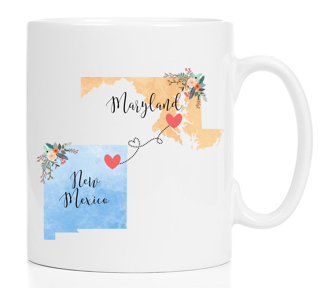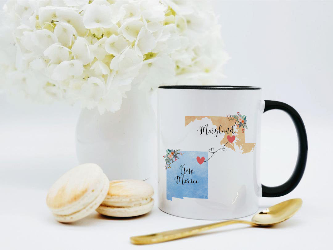 **No Delivery Dates Are Guaranteed. All shipping carriers are currently experiencing delays and transit times can be longer than normal. As a small business, we appreciate your patience and understanding that these circumstances are something that is out of our control. By purchasing this listing you are agreeing that you understand that the shipping date estimation may not be accurate.**Maryland New Mexico Mug / New Mexico Maryland Mug / College Student Going Away/Going Away Gift/College Student Gift/ 11 or 15 oz This cute mug makes the perfect gift for a long distance friend or family member. Order two and enjoy drinking coffee together even though you're in different states! This mug comes in 11 and 15 oz. Dishwasher and microwave safe. Choose between all white or white with a black handle and rim. Design will be placed on both sides of the mug. Would you like this mug customized with names and the hearts on your cities? If so, purchase this listing: https://www.etsy.com/listing/556829447/two-state-mugs-long-distance-mug **Send me a convo if you are interested in a bulk order so I can save you money on shipping!** Mad Kitty Mugs also has prints. Check out our other shop, Mad Kitty Media, where you'll find custom gold foil prints and other wonderful wall art: https://www.etsy.com/shop/MadKittyMedia ***************************************************************************** We'll quickly ship your mug via Priority mail in a sturdy box with biodegradable peanuts and plenty of protective packaging.