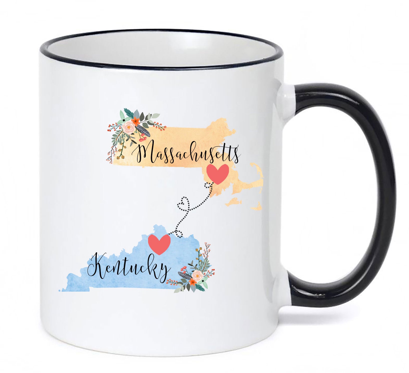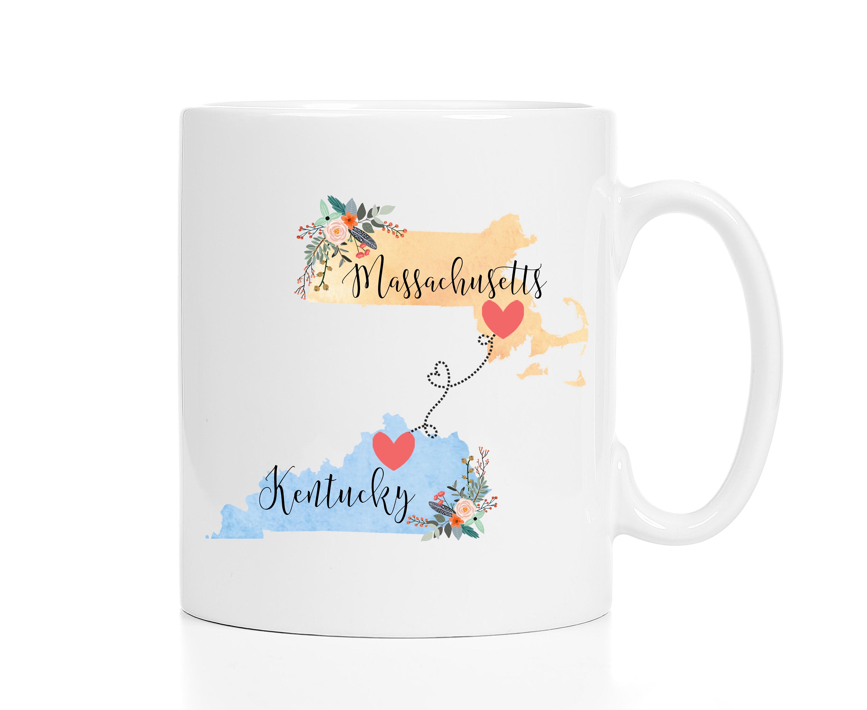 **No Delivery Dates Are Guaranteed. All shipping carriers are currently experiencing delays and transit times can be longer than normal. As a small business, we appreciate your patience and understanding that these circumstances are something that is out of our control. By purchasing this listing you are agreeing that you understand that the shipping date estimation may not be accurate.**Massachusetts Kentucky Mug / Massachusetts to Kentucky Mug / Massachusetts Kentucky Gift / Best Friend Gift / Mother's Day Gift This cute mug makes the perfect gift for a long distance friend or family member. Order two and enjoy drinking coffee together even though you're in different states! This mug comes in 11 and 15 oz. Dishwasher and microwave safe. Choose between all white or white with a black handle and rim. Design will be placed on both sides of the mug. Would you like this mug customized with names and the hearts on your cities? If so, purchase this listing: https://www.etsy.com/listing/556829447/two-state-mugs-long-distance-mug **Send me a convo if you are interested in a bulk order so I can save you money on shipping!** Mad Kitty Mugs also has prints. Check out our other shop, Mad Kitty Media, where you'll find custom gold foil prints and other wonderful wall art: https://www.etsy.com/shop/MadKittyMedia ***************************************************************************** We'll quickly ship your mug via Priority mail in a sturdy box with biodegradable peanuts and plenty of protective packaging.