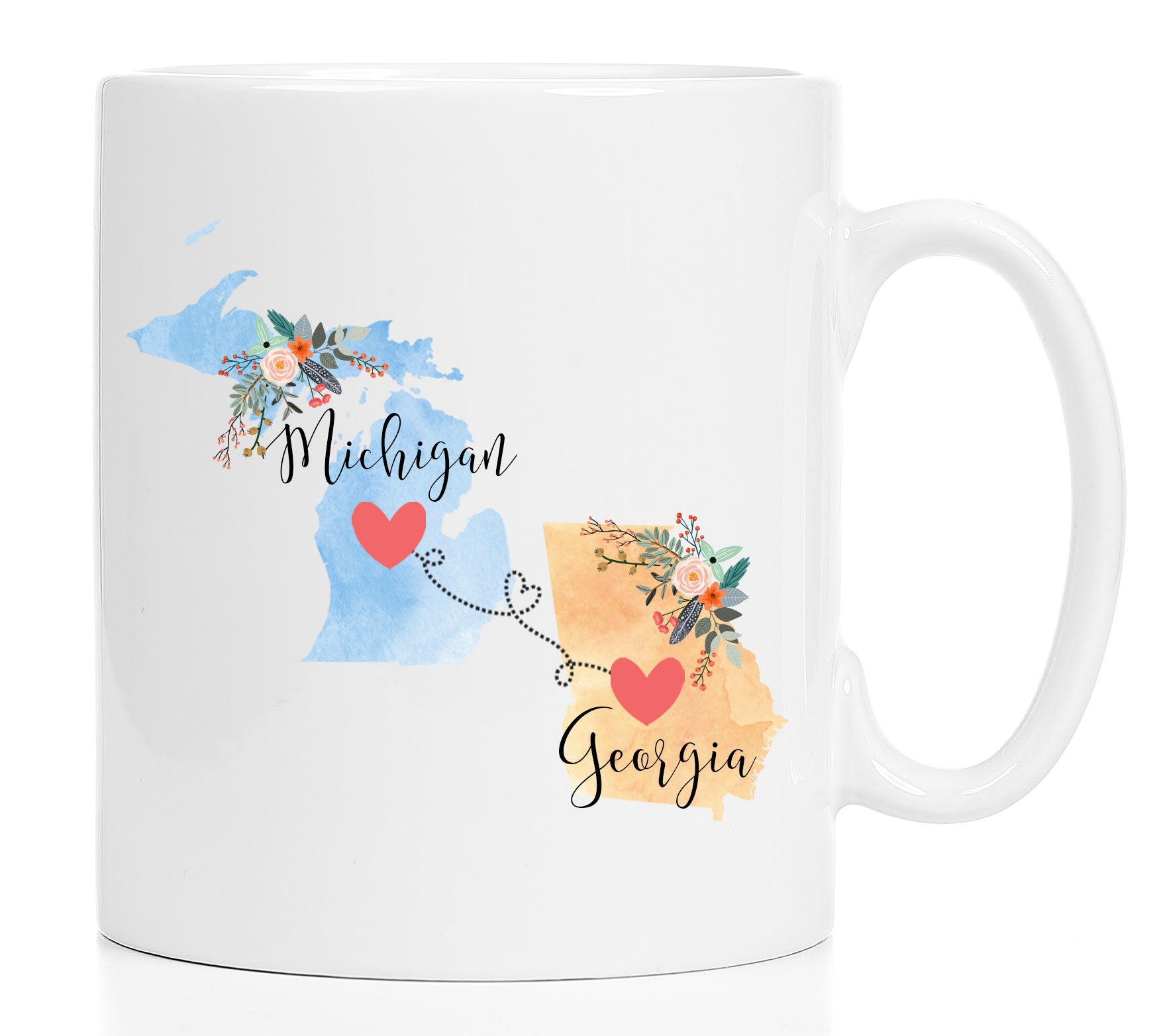 **No Delivery Dates Are Guaranteed. All shipping carriers are currently experiencing delays and transit times can be longer than normal. As a small business, we appreciate your patience and understanding that these circumstances are something that is out of our control. By purchasing this listing you are agreeing that you understand that the shipping date estimation may not be accurate.**Michigian Georgia Mug / Georgia Michigan Mug / Michigan to Georgia Gift / Georgia to Michigan Mug / 11 or 15 oz This cute mug makes the perfect gift for a long distance friend or family member. Order two and enjoy drinking coffee together even though you're in different states! This mug comes in 11 and 15 oz. Dishwasher and microwave safe. Choose between all white or white with a black handle and rim. Design will be placed on both sides of the mug. Would you like this mug customized with names and the hearts on your cities? If so, purchase this listing: https://www.etsy.com/listing/556829447/two-state-mugs-long-distance-mug **Send me a convo if you are interested in a bulk order so I can save you money on shipping!** Mad Kitty Mugs also has prints. Check out our other shop, Mad Kitty Media, where you'll find custom gold foil prints and other wonderful wall art: https://www.etsy.com/shop/MadKittyMedia ***************************************************************************** We'll quickly ship your mug via Priority mail in a sturdy box with biodegradable peanuts and plenty of protective packaging.
