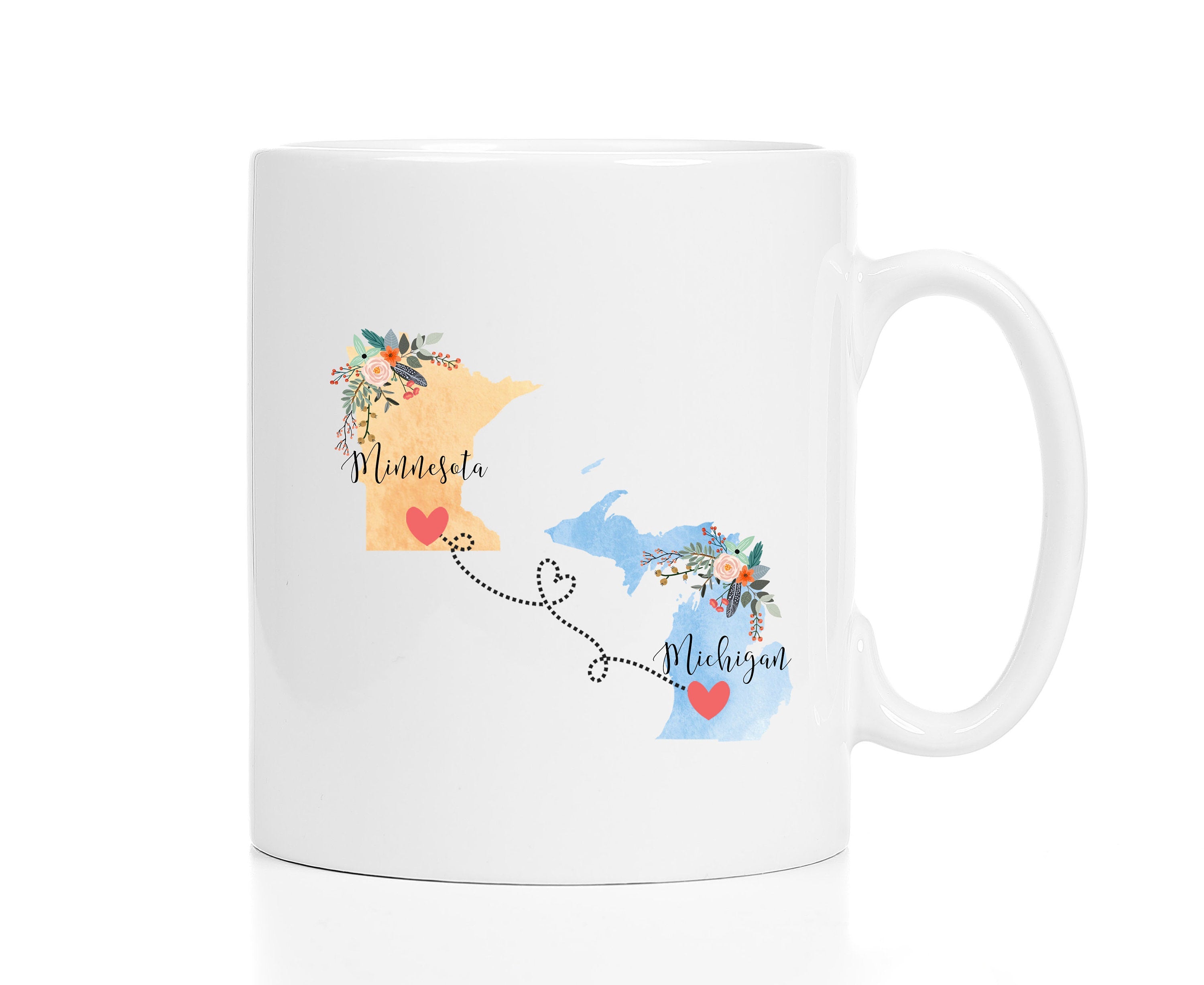 **No Delivery Dates Are Guaranteed. All shipping carriers are currently experiencing delays and transit times can be longer than normal. As a small business, we appreciate your patience and understanding that these circumstances are something that is out of our control. By purchasing this listing you are agreeing that you understand that the shipping date estimation may not be accurate.**Michigan Minnesota Mug / Minnesota Michigan Mug / Michigan to Minnesota Gift / Minnesota to Michigan Gift / 11 or 15 oz This cute mug makes the perfect gift for a long distance friend or family member. Order two and enjoy drinking coffee together even though you're in different states! This mug comes in 11 and 15 oz. Dishwasher and microwave safe. Choose between all white or white with a black handle and rim. Design will be placed on both sides of the mug. Would you like this mug customized with names and the hearts on your cities? If so, purchase this listing: https://www.etsy.com/listing/556829447/two-state-mugs-long-distance-mug **Send me a convo if you are interested in a bulk order so I can save you money on shipping!** Mad Kitty Mugs also has prints. Check out our other shop, Mad Kitty Media, where you'll find custom gold foil prints and other wonderful wall art: https://www.etsy.com/shop/MadKittyMedia ***************************************************************************** We'll quickly ship your mug via Priority mail in a sturdy box with biodegradable peanuts and plenty of protective packaging.