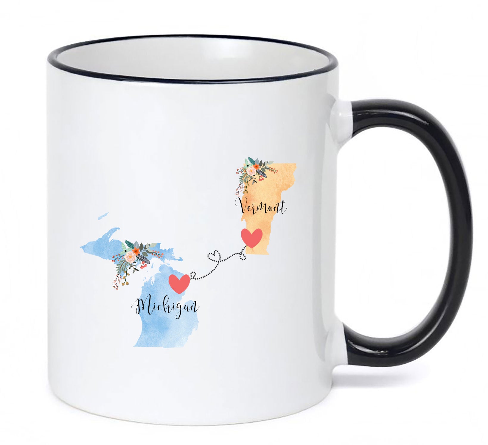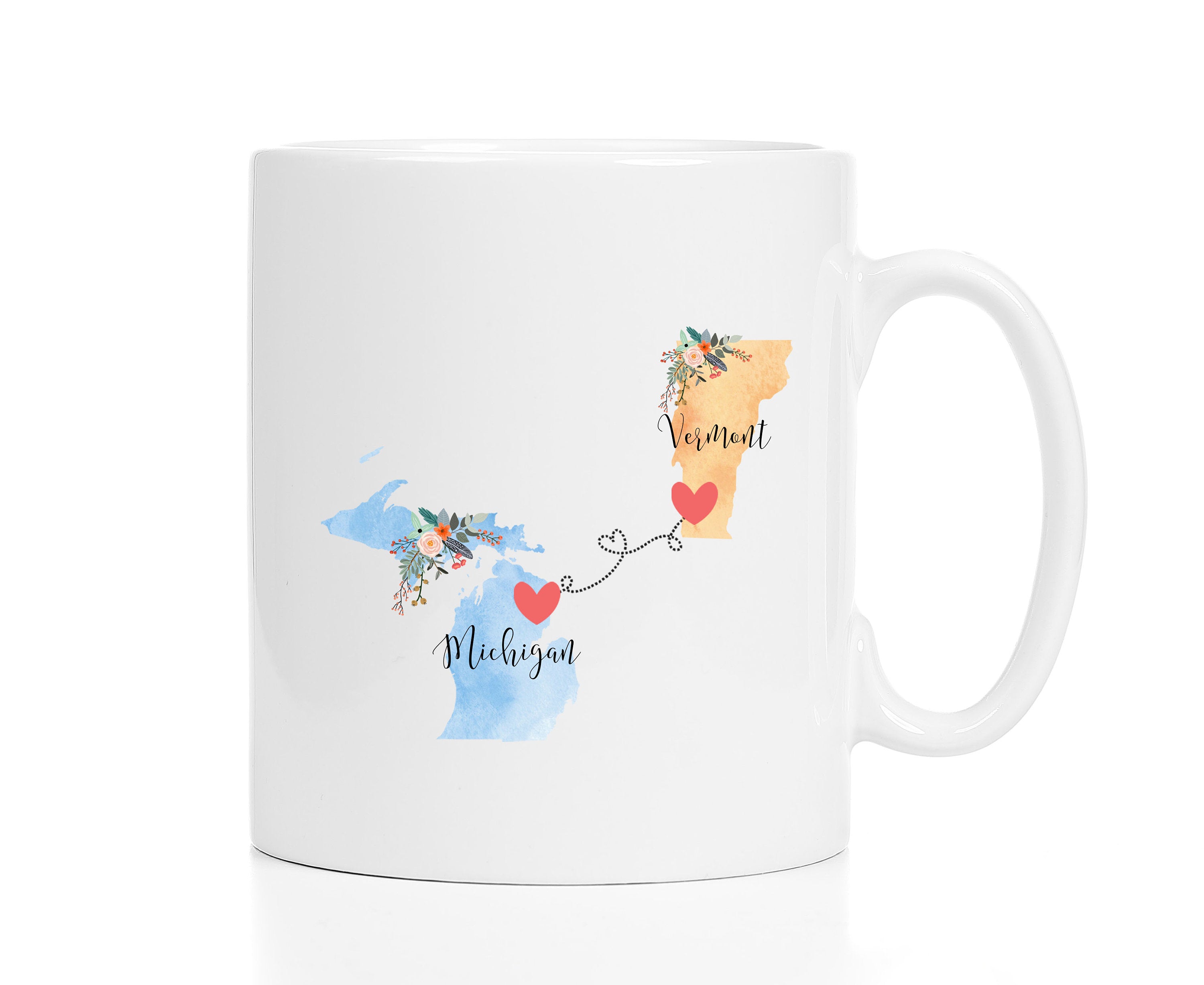 **No Delivery Dates Are Guaranteed. All shipping carriers are currently experiencing delays and transit times can be longer than normal. As a small business, we appreciate your patience and understanding that these circumstances are something that is out of our control. By purchasing this listing you are agreeing that you understand that the shipping date estimation may not be accurate.**Michigan Vermont Mug / Vermont Michigan Mug / Michigan to Vermont Gift / Vermont to Michigan Gift / 11 or 15 oz