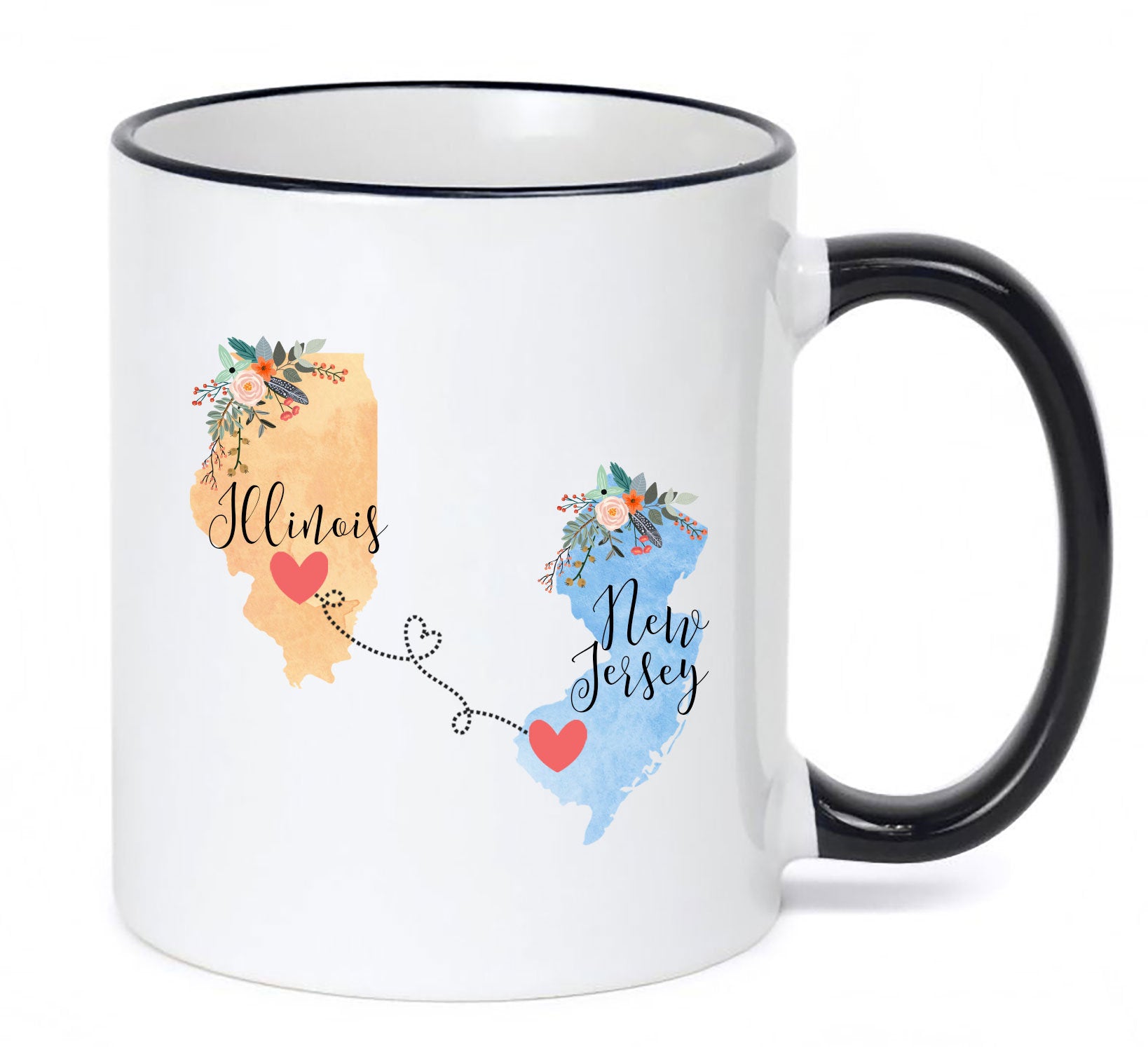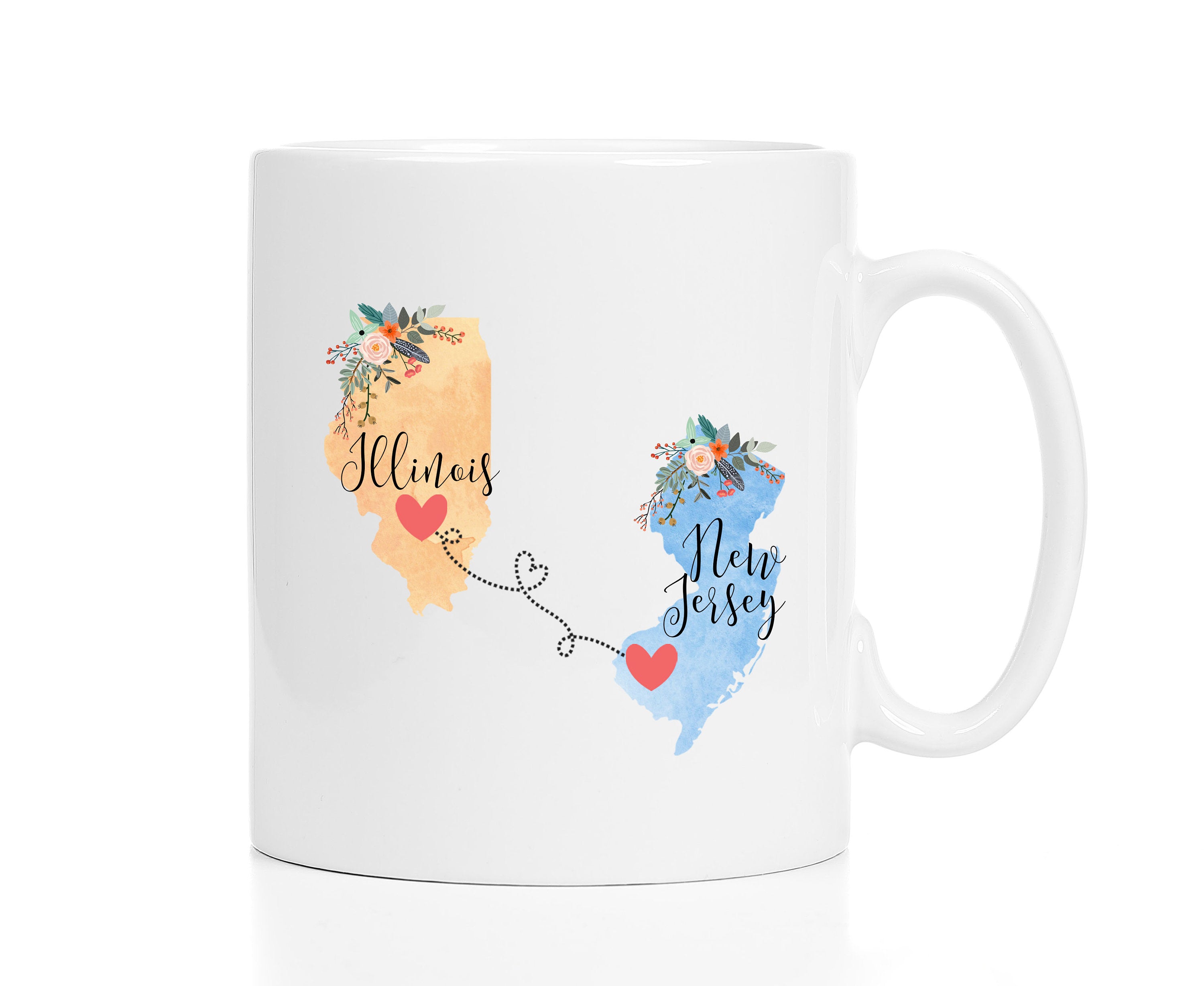 **No Delivery Dates Are Guaranteed. All shipping carriers are currently experiencing delays and transit times can be longer than normal. As a small business, we appreciate your patience and understanding that these circumstances are something that is out of our control. By purchasing this listing you are agreeing that you understand that the shipping date estimation may not be accurate.**New Jersey Illinois Mug / Illinois New Jersey Mug / New Jersey to Illinois Gift / Illinois to New Jersey Gift / 11 or 15 oz