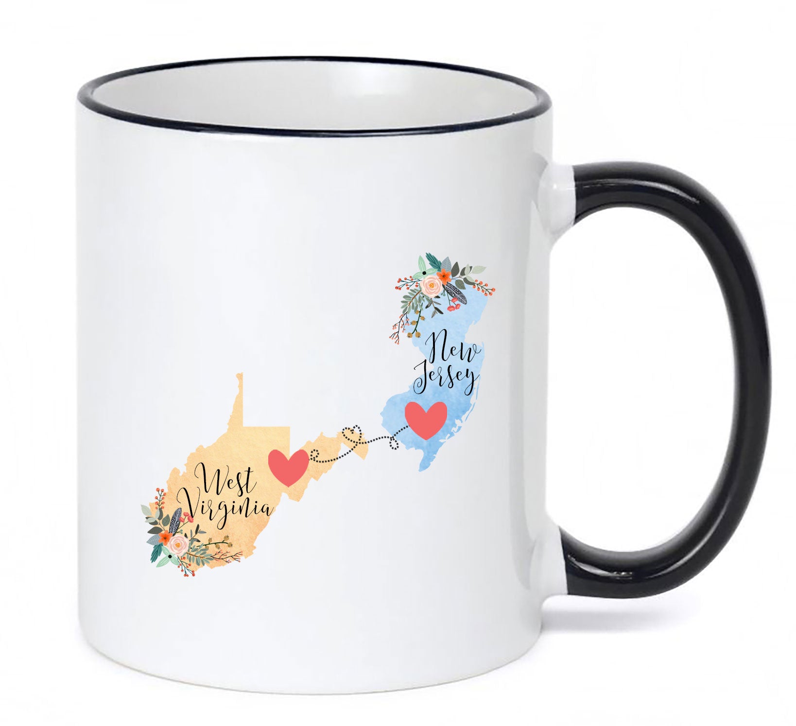 **No Delivery Dates Are Guaranteed. All shipping carriers are currently experiencing delays and transit times can be longer than normal. As a small business, we appreciate your patience and understanding that these circumstances are something that is out of our control. By purchasing this listing you are agreeing that you understand that the shipping date estimation may not be accurate.**New Jersey West Virginia Mug / West Virginia New Jersey Mug / New Jersey to WV Gift / WV to NJ Gift / Summer Vacation Mug / 11 or 15 oz This cute mug makes the perfect gift for a long distance friend or family member. Order two and enjoy drinking coffee together even though you're in different states! This mug comes in 11 and 15 oz. Dishwasher and microwave safe. Choose between all white or white with a black handle and rim. Design will be placed on both sides of the mug. Would you like this mug customized with names and the hearts on your cities? If so, purchase this listing: https://www.etsy.com/listing/556829447/two-state-mugs-long-distance-mug **Send me a convo if you are interested in a bulk order so I can save you money on shipping!** Mad Kitty Mugs also has prints. Check out our other shop, Mad Kitty Media, where you'll find custom gold foil prints and other wonderful wall art: https://www.etsy.com/shop/MadKittyMedia ***************************************************************************** We'll quickly ship your mug via Priority mail in a sturdy box with biodegradable peanuts and plenty of protective packaging.