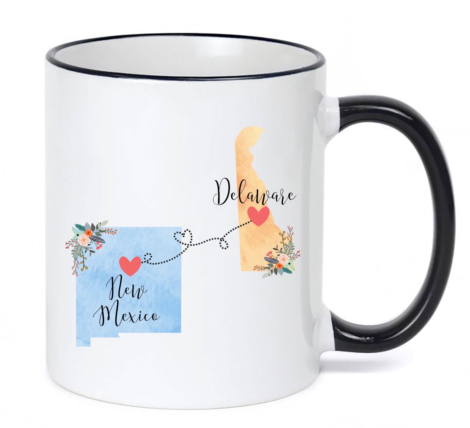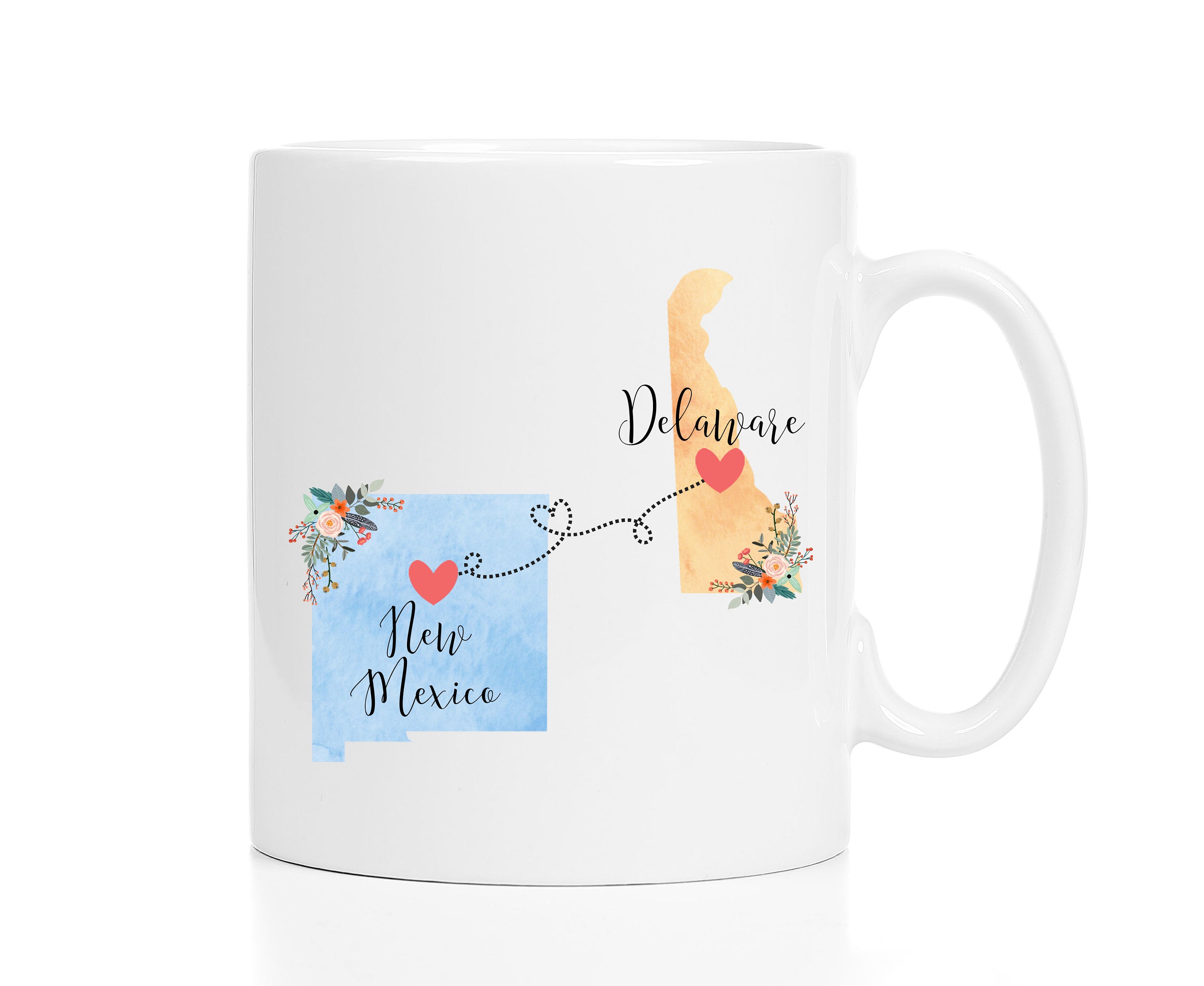**No Delivery Dates Are Guaranteed. All shipping carriers are currently experiencing delays and transit times can be longer than normal. As a small business, we appreciate your patience and understanding that these circumstances are something that is out of our control. By purchasing this listing you are agreeing that you understand that the shipping date estimation may not be accurate.**New Mexico Delaware Mug / Delaware New Mexico Gift / New Mexico to Delaware Coffee Mug / Delaware to NM Cup / Hostess Gift / 11 or 15 oz