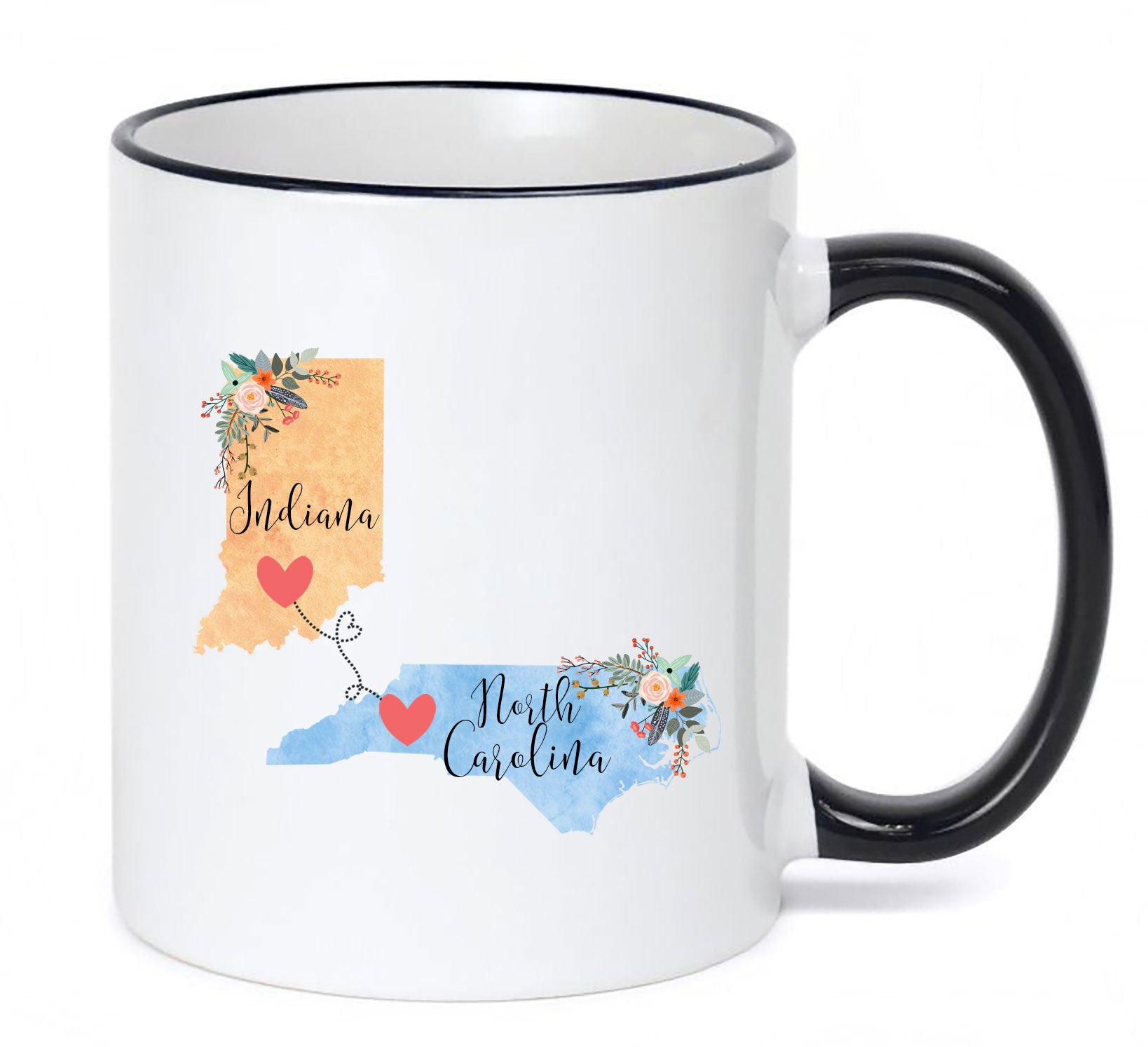 **No Delivery Dates Are Guaranteed. All shipping carriers are currently experiencing delays and transit times can be longer than normal. As a small business, we appreciate your patience and understanding that these circumstances are something that is out of our control. By purchasing this listing you are agreeing that you understand that the shipping date estimation may not be accurate.**North Carolina Indiana Mug / Indiana North Carolina Mug / North Carolina to Indiana Gift / Indiana to North Carolina Gift / 11 or 15 oz
