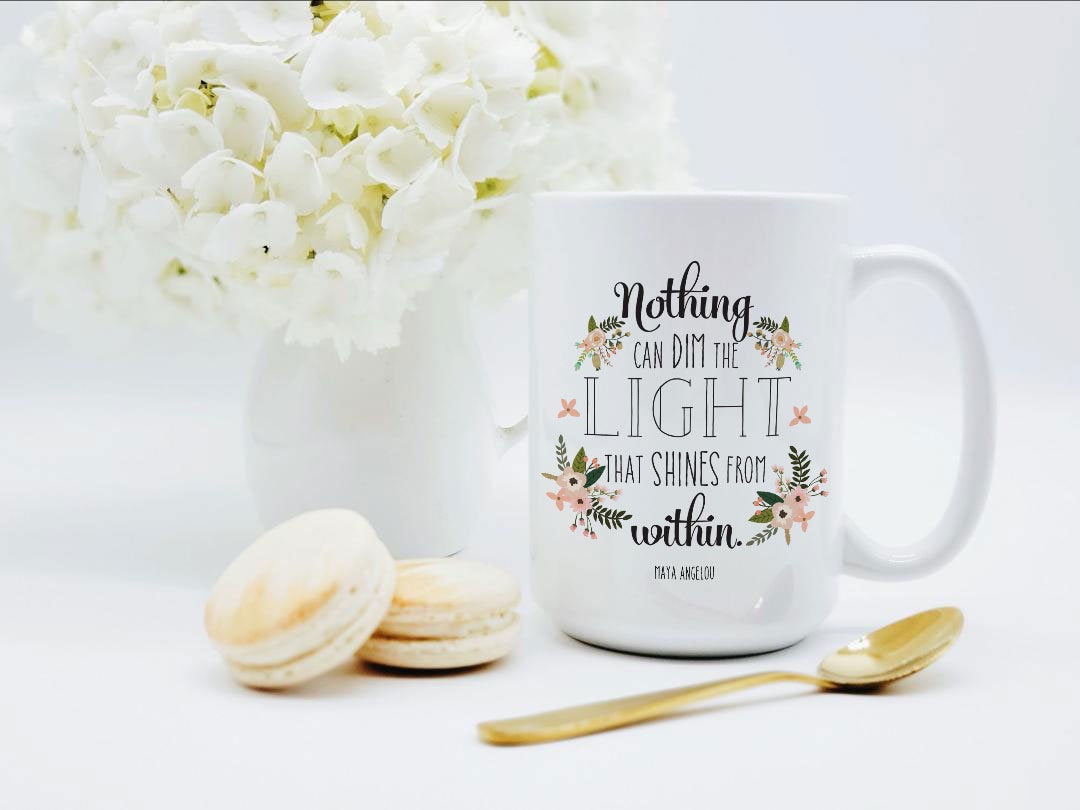 **No Delivery Dates Are Guaranteed. All shipping carriers are currently experiencing delays and transit times can be longer than normal. As a small business, we appreciate your patience and understanding that these circumstances are something that is out of our control. By purchasing this listing you are agreeing that you understand that the shipping date estimation may not be accurate.**Nothing Can Dim the Light That Shines Within Mug / Maya Angelou Quote / Maya Angelou Mug / Inspirational Coffee Cup / Pretty Mug 11 or 15 oz