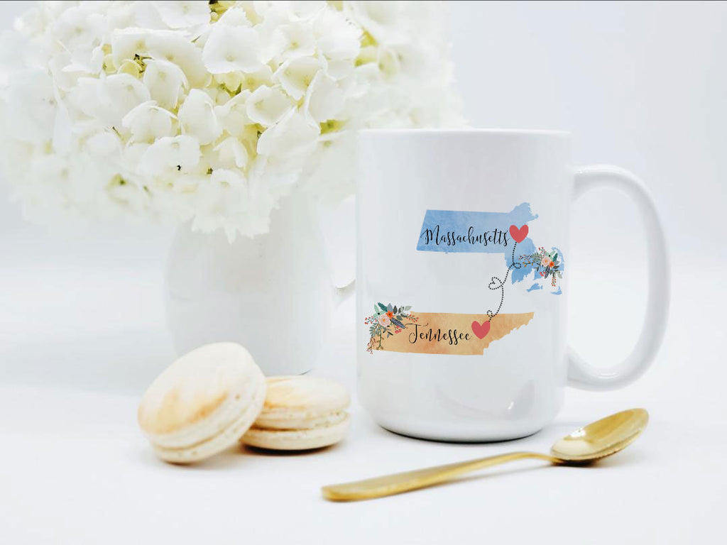 **No Delivery Dates Are Guaranteed. All shipping carriers are currently experiencing delays and transit times can be longer than normal. As a small business, we appreciate your patience and understanding that these circumstances are something that is out of our control. By purchasing this listing you are agreeing that you understand that the shipping date estimation may not be accurate.**Tennessee Massachusetts Mug / Massachusetts Tennessee Mug / Tennessee to Massachusetts Gift / Massachusetts to Tennessee Gift / 11 or 15 oz